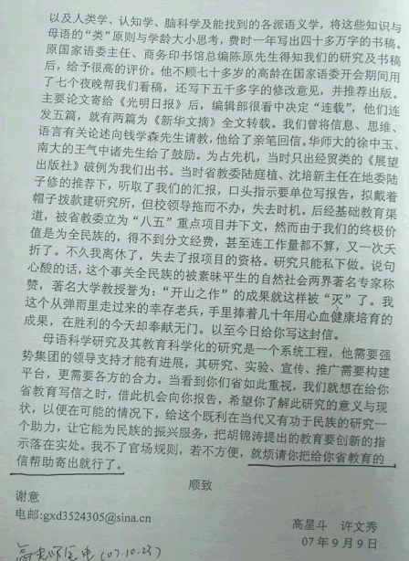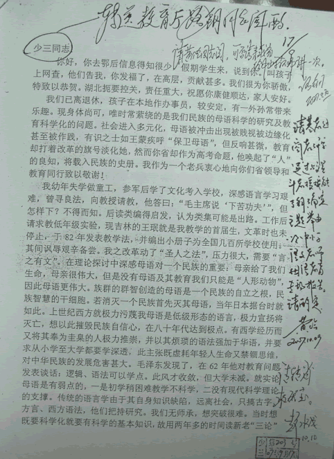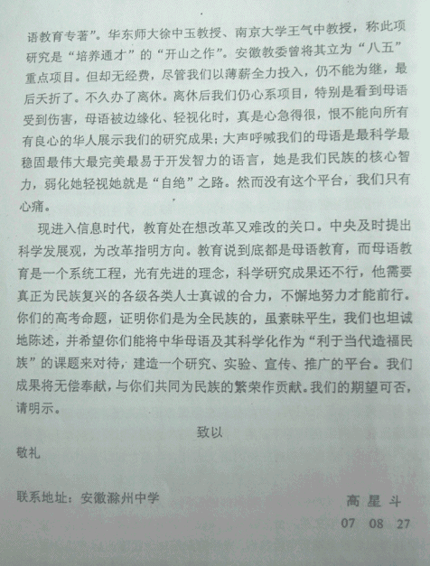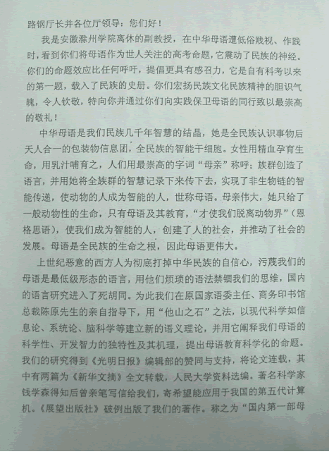 退休教授致信省領導疾呼保衛母語 肯定我省高考作文命題