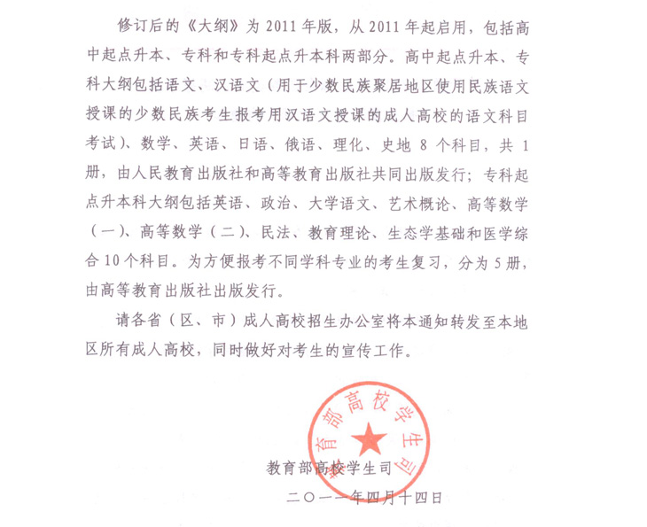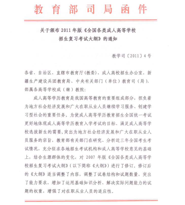 關(guān)于頒布2011年版《全國(guó)各類成人高等學(xué)校招生復(fù)習(xí)考試大綱》的通知