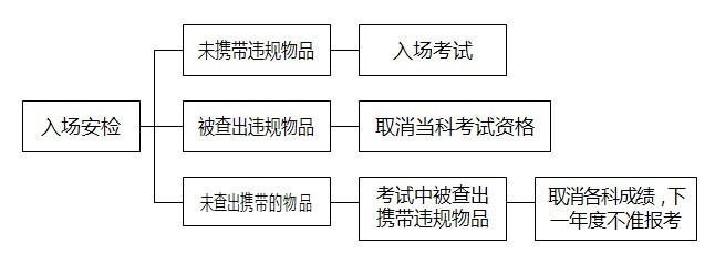 2.考生應主動配合安檢。接受安檢前,應按照監考員的指令,主動將攜帶的違規物品放到考場專設的“考生物品存放處”。安檢過程中如有報警聲響起,應出示相關物品并進行解釋。如因上廁所等特殊情況出考場后返回考場,應再次接受安檢。