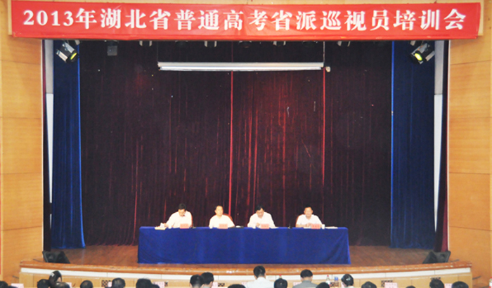 5月29日, 2013年湖北省普通高考省派巡視員培訓(xùn)會在湖北大學(xué)學(xué)術(shù)報告廳舉行。省教育廳副廳長徐雁冰出席會議并作重要講話,省教育考試院副院長徐澤貴、黃恩育,高考辦主任胡向東等出席會議,會議由黃恩育主持。
