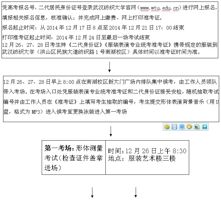 報考戲劇與影視學類服裝表演專業的考生請于2014年12月17日8點至2014年12月21日17:00,憑高考報名號及二代身份證號登錄武漢紡織大學官網(www.wtu.edu.cn)填報相關報名信息進行網上報名并完成網上繳費。請考生務必在規定時間內,合理安排時間進行網上報名和網上繳費,以免錯過網報時間。報名及考試流程如下: