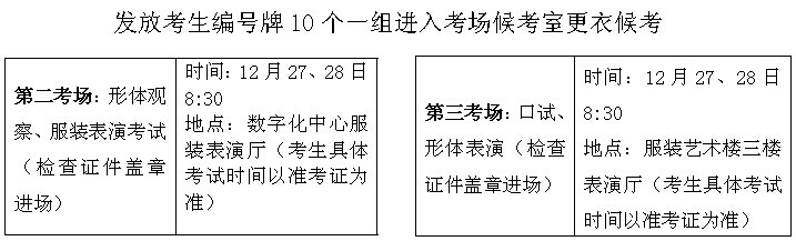 (4)面試:共設三個考場。考生分兩個時間完成, 一是12月26日全體考生參加第一考場形體測量的考試。二是12月27-28日參加第二、三考場的考試,考生以準考證時間為準。考試內容:第二考場:科目二形體觀察、科目三服裝表演;第三考場:科目四口試、科目五形體表演。包括形體、服裝表演展示、抽題回答問題等多個環節,第二考場和第三考場科目交叉進行。