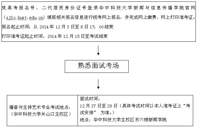 報考戲劇與影視學類播音與主持藝術專業的考生請于2014年12月3日至2014年12月8日17:00,憑高考報名號及二代身份證號登錄華中科技大學新聞與信息傳播學院官網(sjic.hust.edu.cn)填報相關報名信息進行網上報名并完成網上繳費。請考生務必在規定時間內,合理安排時間進行網上報名和網上繳費,以免錯過網報時間。考試流程如下: