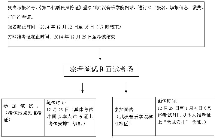 5、打印準考證:請考生于2014年12月25日-2015年12月27日,憑高考報名號和二代身份證號登錄武漢音樂學院招生考試網自行打印準考證。