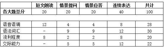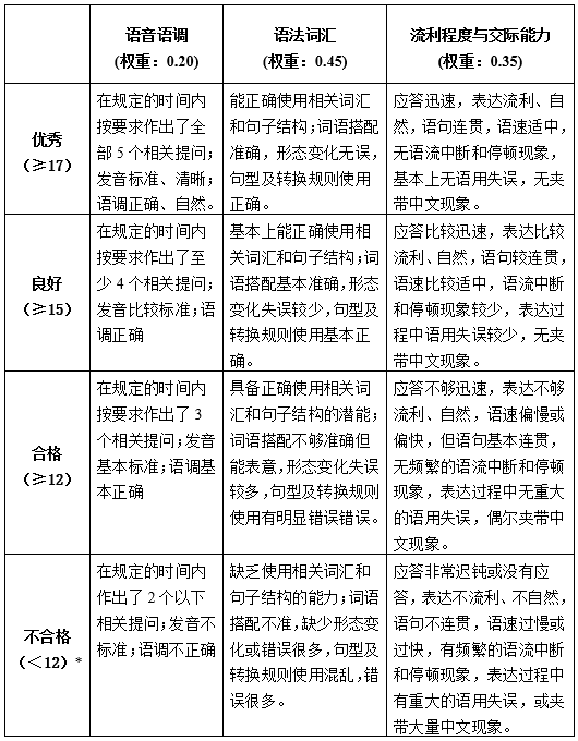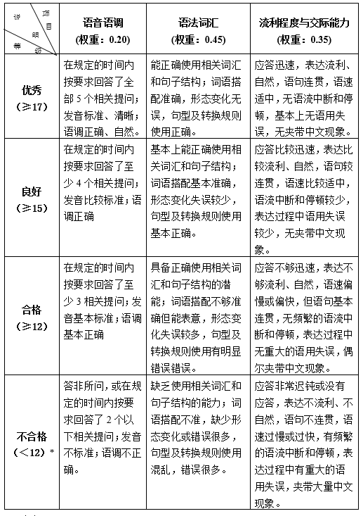 本級考試采用分題、分項評分的方法進行評分。除了按上述4個環節分為4大題外,各大題還按所涉能力不同,從語音語調、語法詞匯、流利程度、交際能力等4各方面進行評價,具體如下: