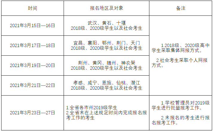 2021年湖北省普通高中學(xué)業(yè)水平合格性考試全省統(tǒng)考科目考試(下稱“學(xué)考合格考”)定于6月26日至28日舉行,現(xiàn)將考試安排和報(bào)名工作有關(guān)事項(xiàng)通告如下,請(qǐng)考生及時(shí)辦理報(bào)名手續(xù)。