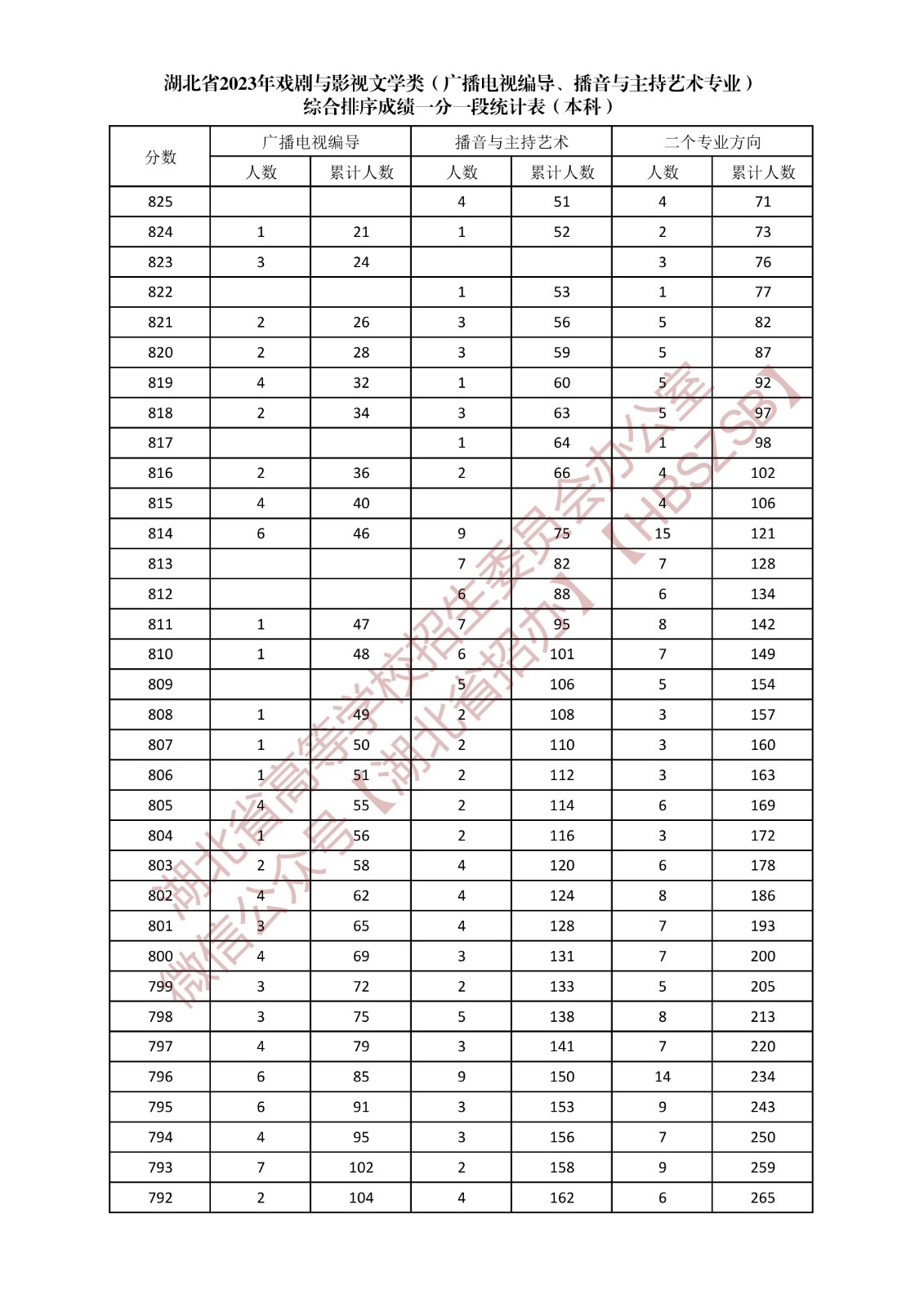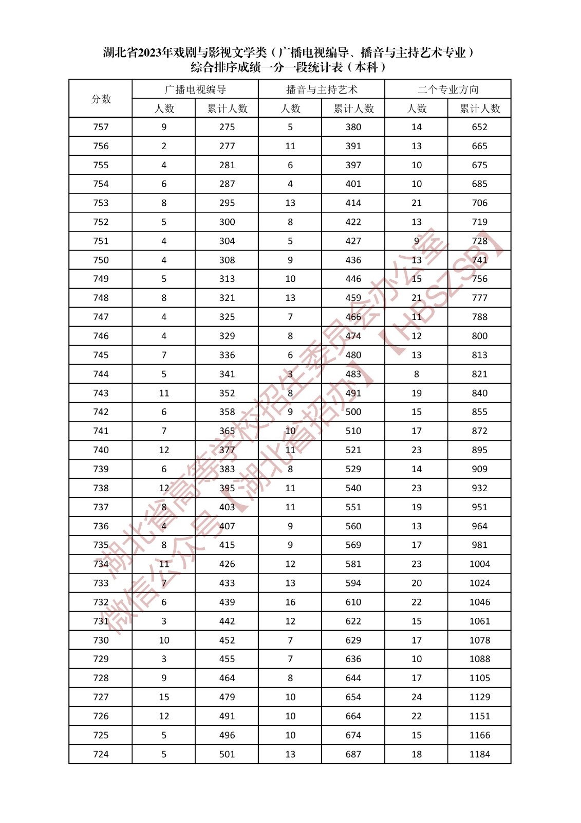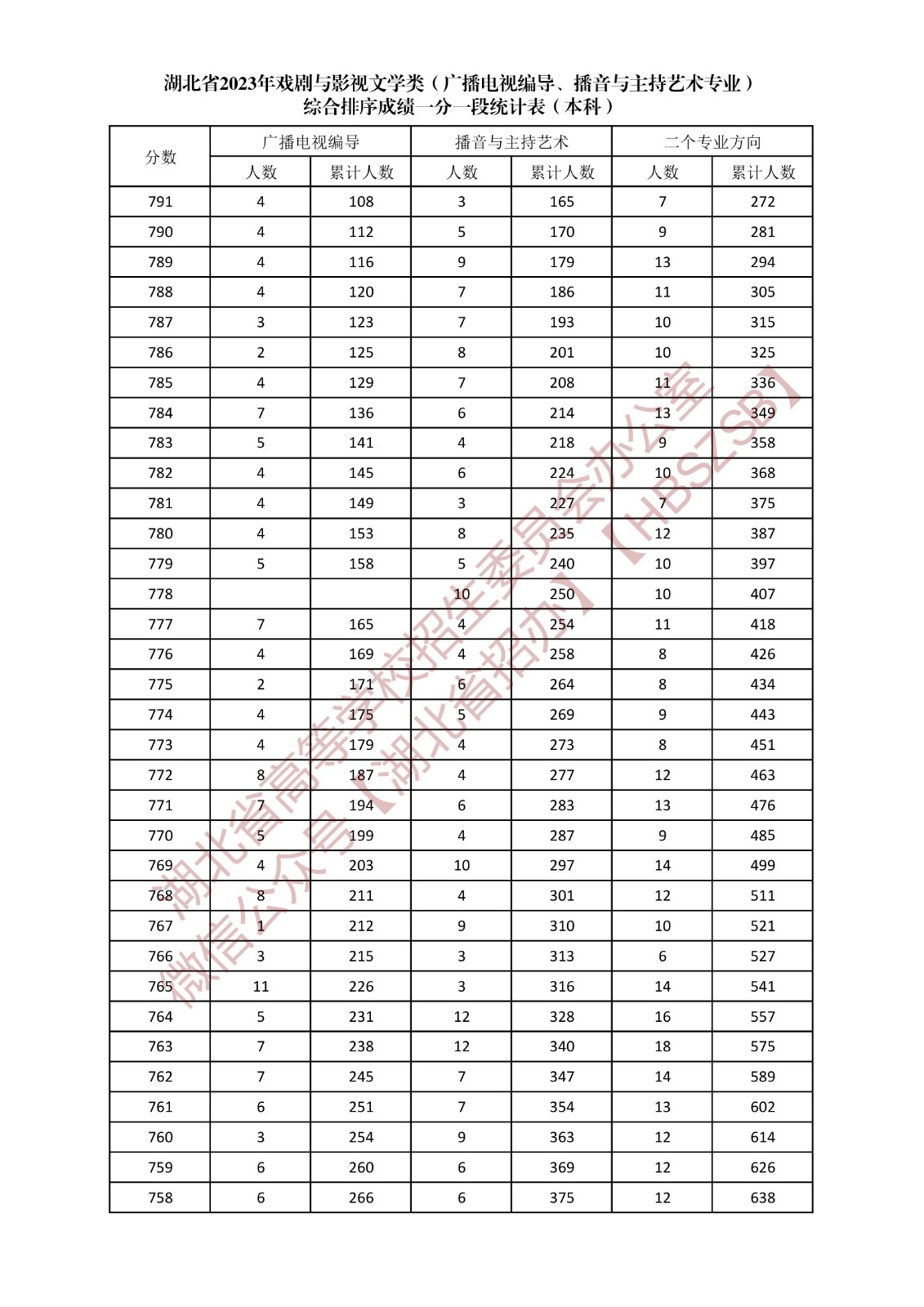 湖北省2023年戲劇與影視文學類(廣播電視編導、播音與主持藝術專業)綜合排序成績一分一段統計表(本科)