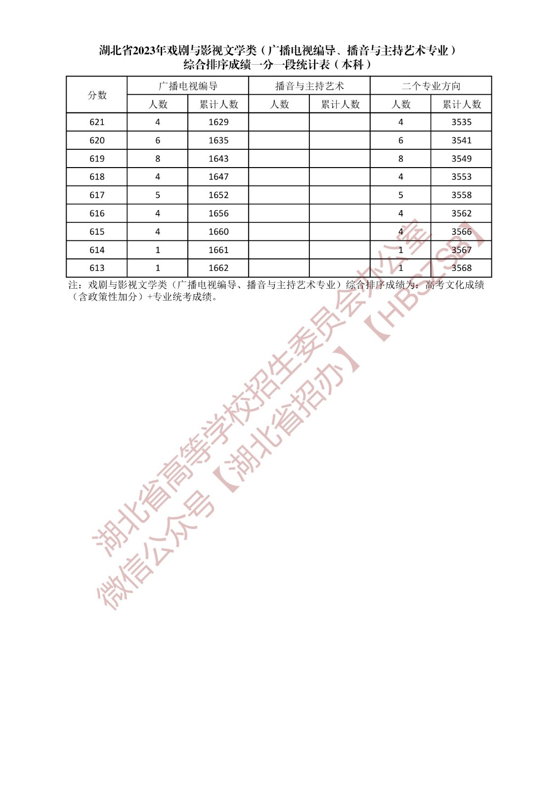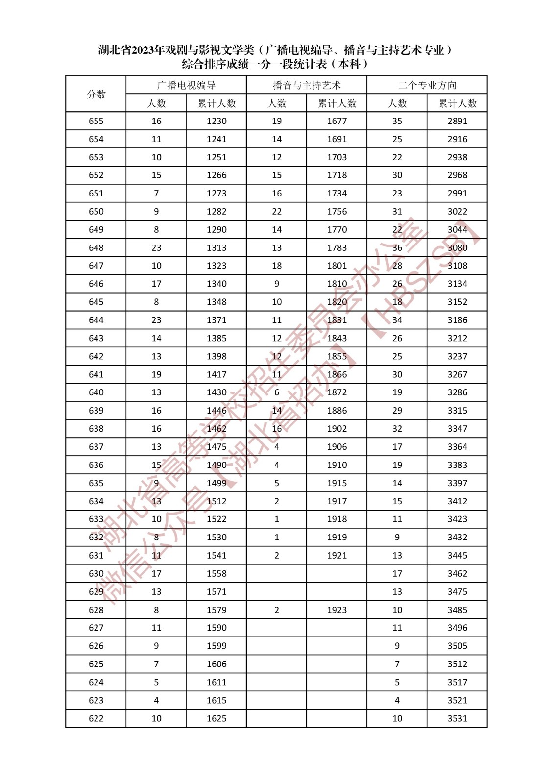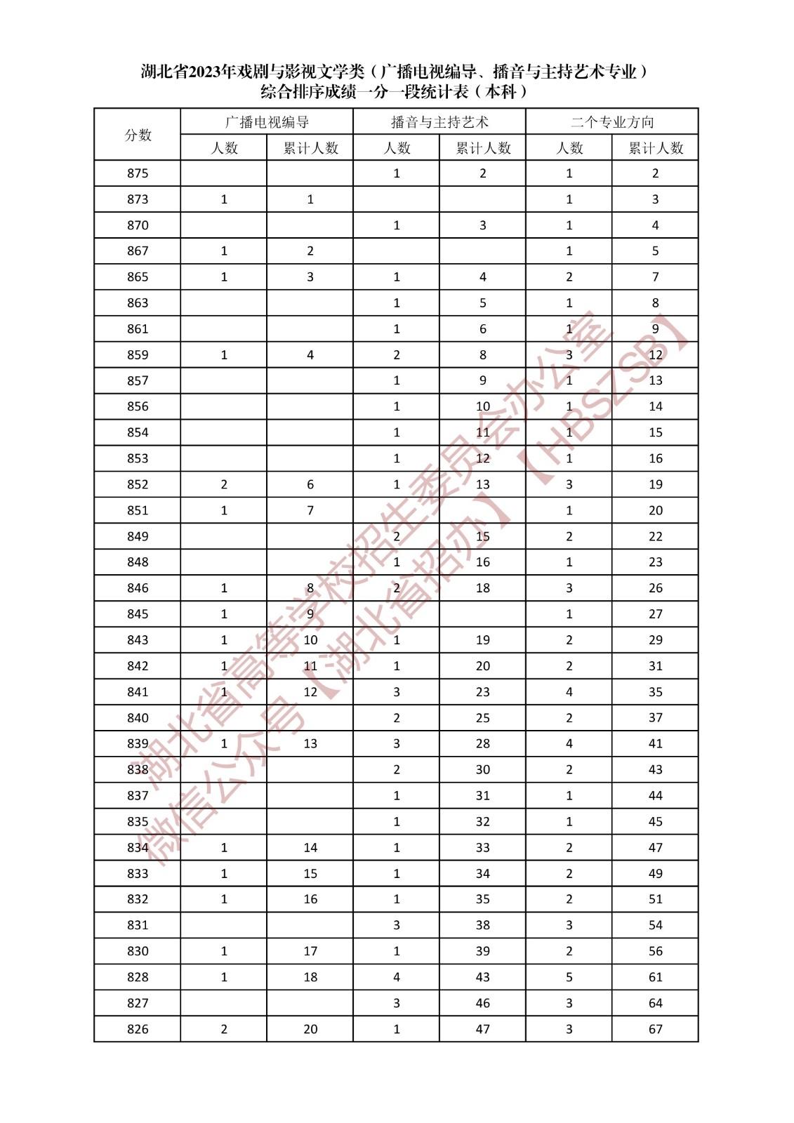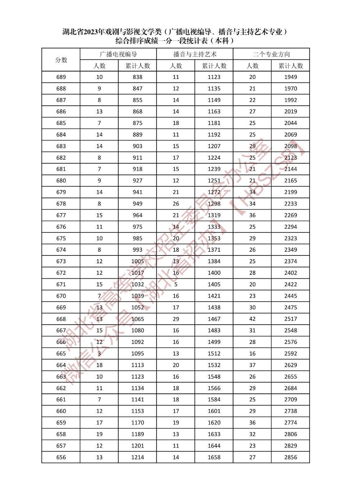 湖北省2023年戲劇與影視文學類(廣播電視編導、播音與主持藝術專業)綜合排序成績一分一段統計表(本科)
