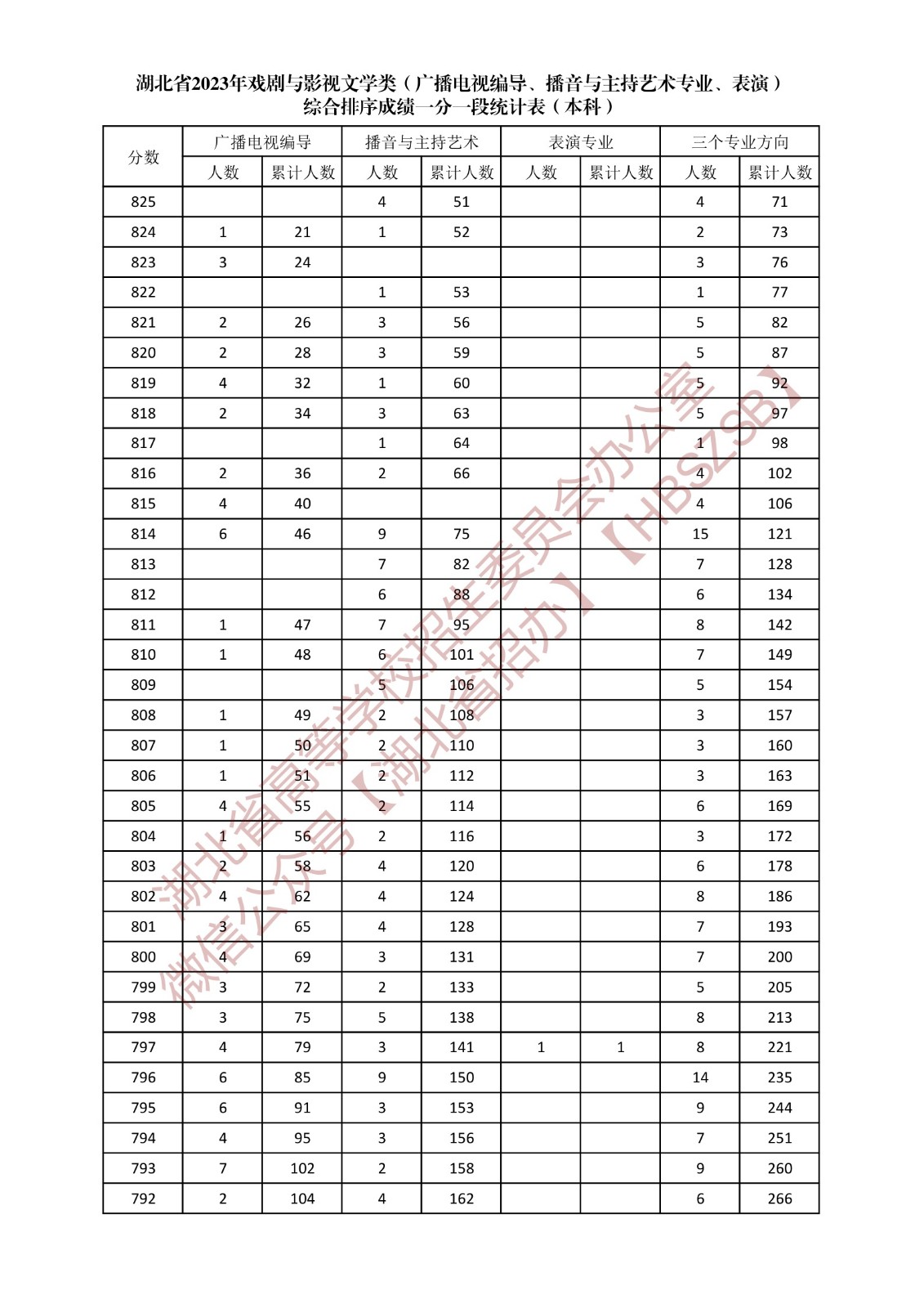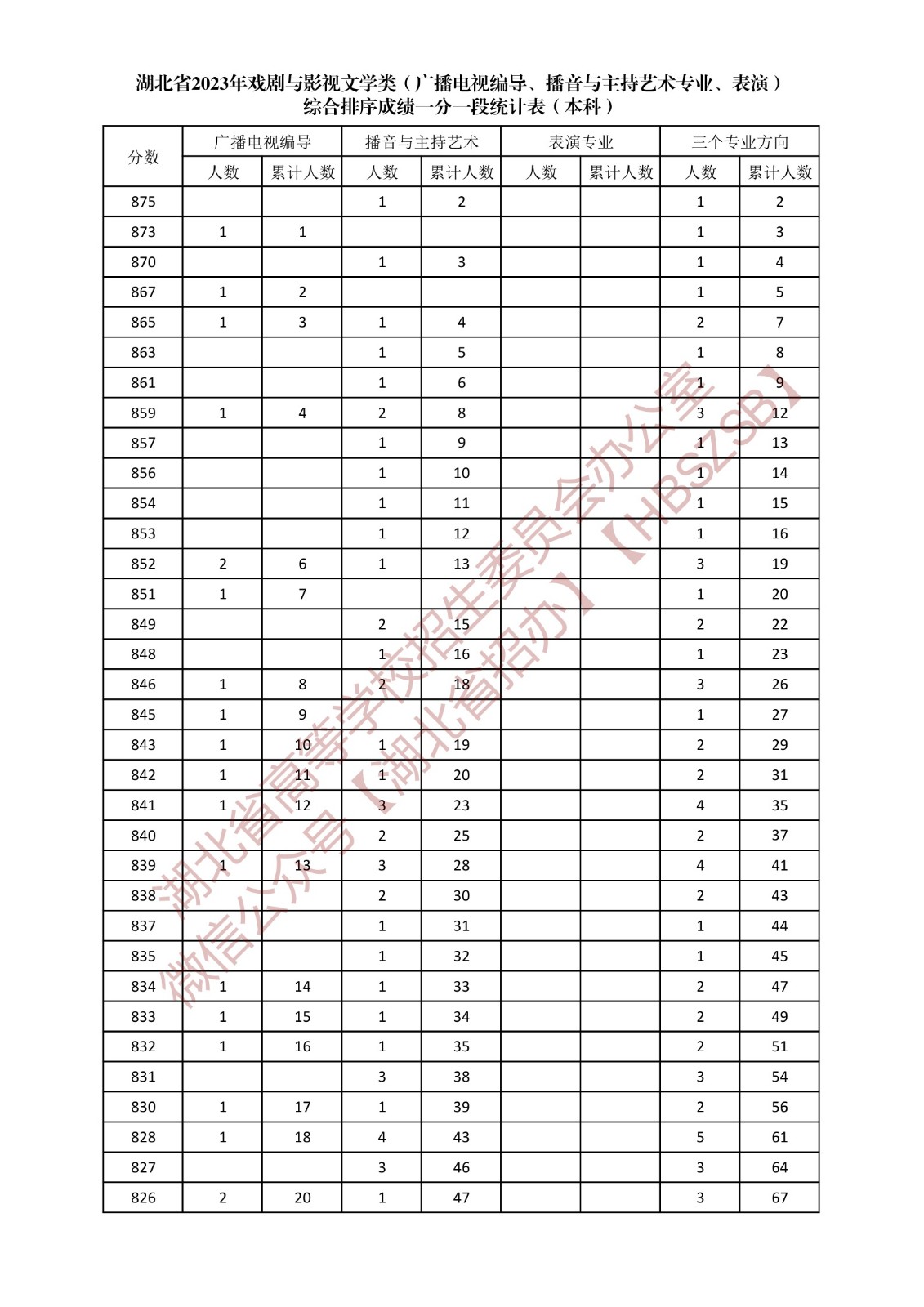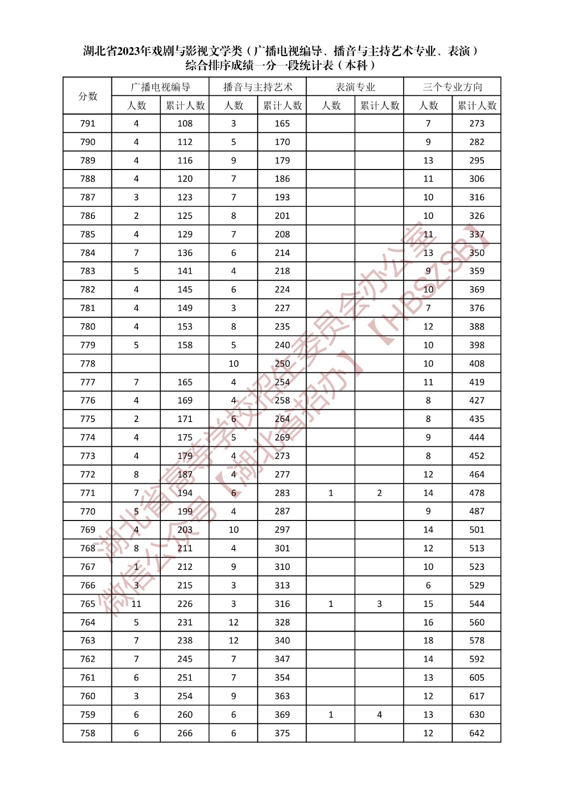 湖北省2023年戲劇與影視文學類(廣播電視編導、播音與主持藝術專業、表演)綜合排序成績一分一段統計表(本科)