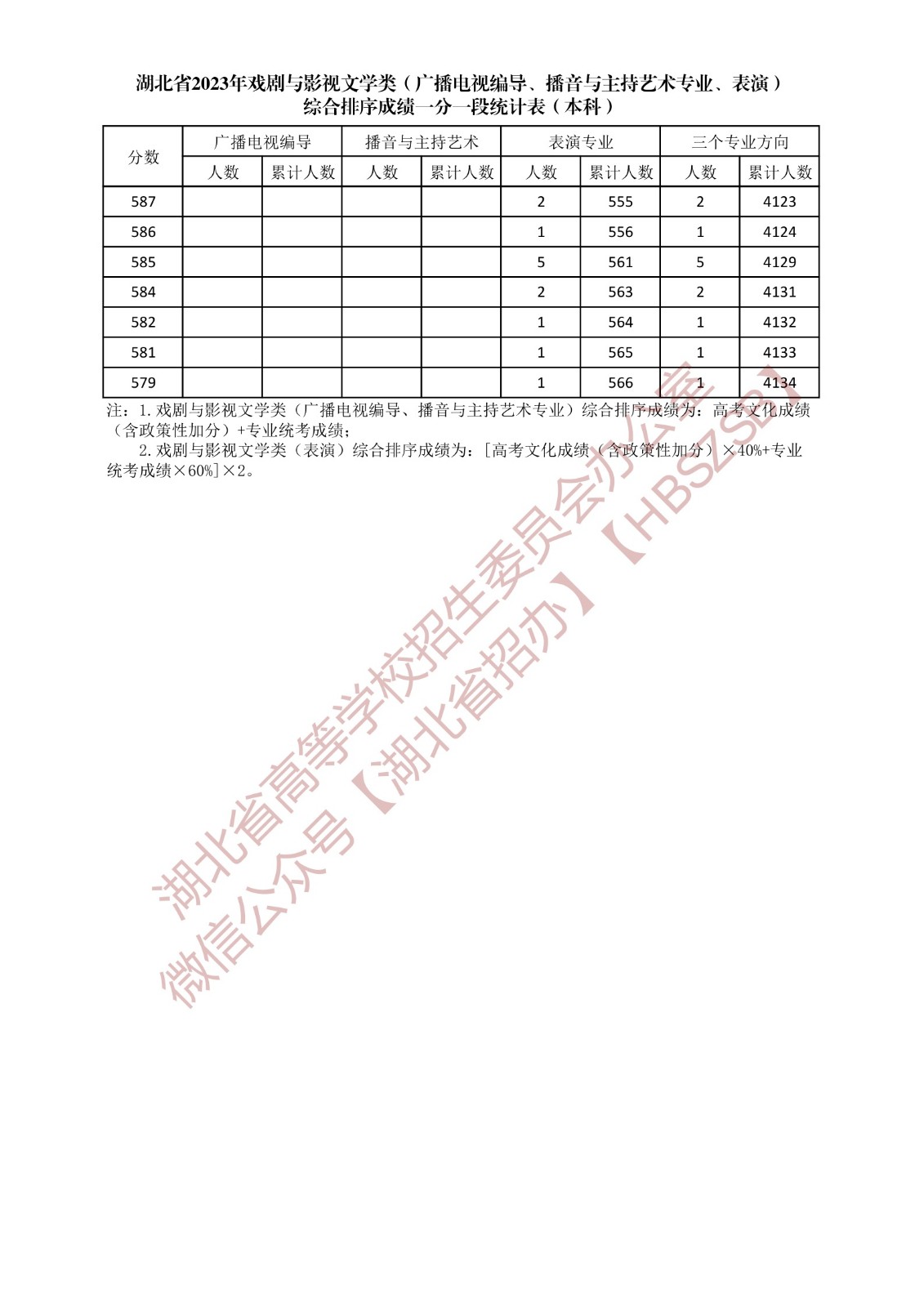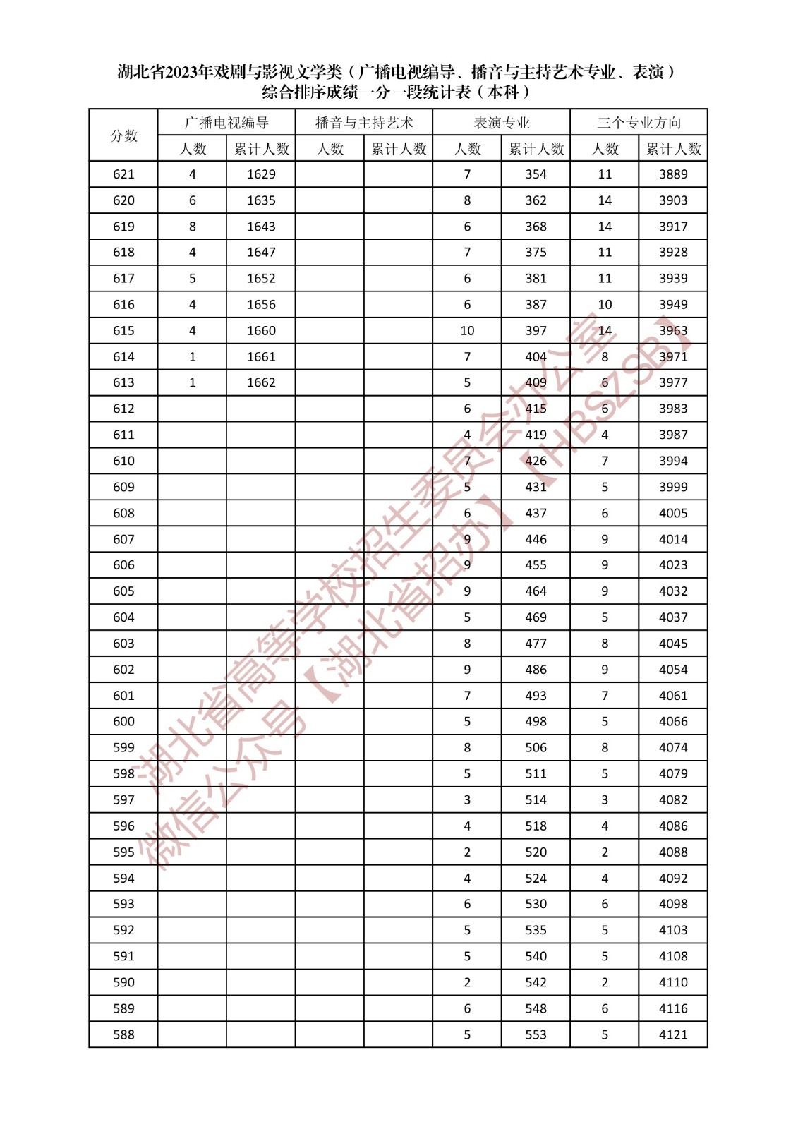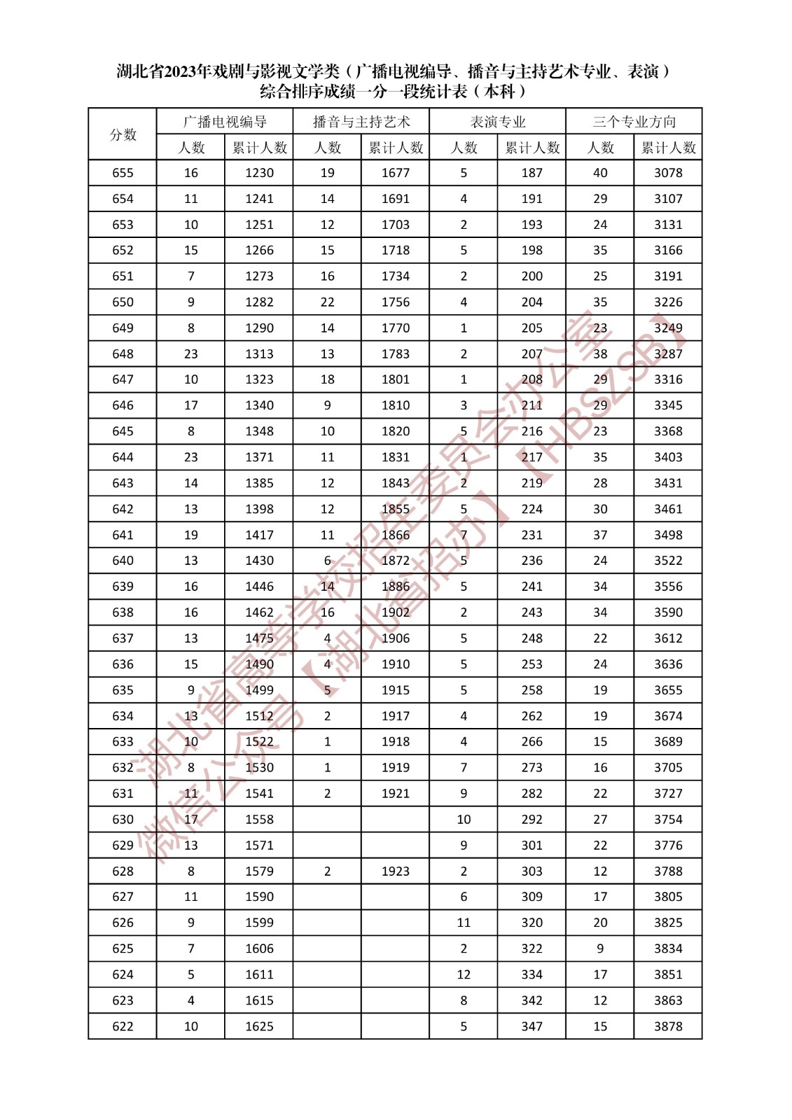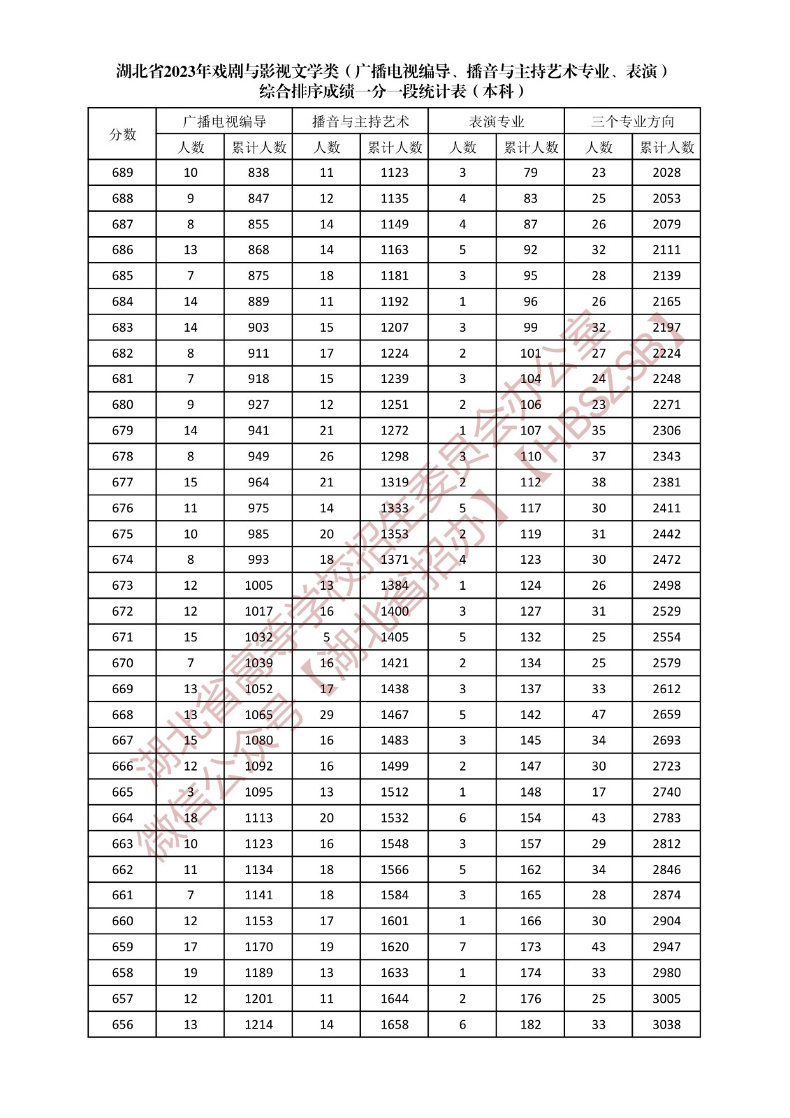 湖北省2023年戲劇與影視文學類(廣播電視編導、播音與主持藝術專業、表演)綜合排序成績一分一段統計表(本科)