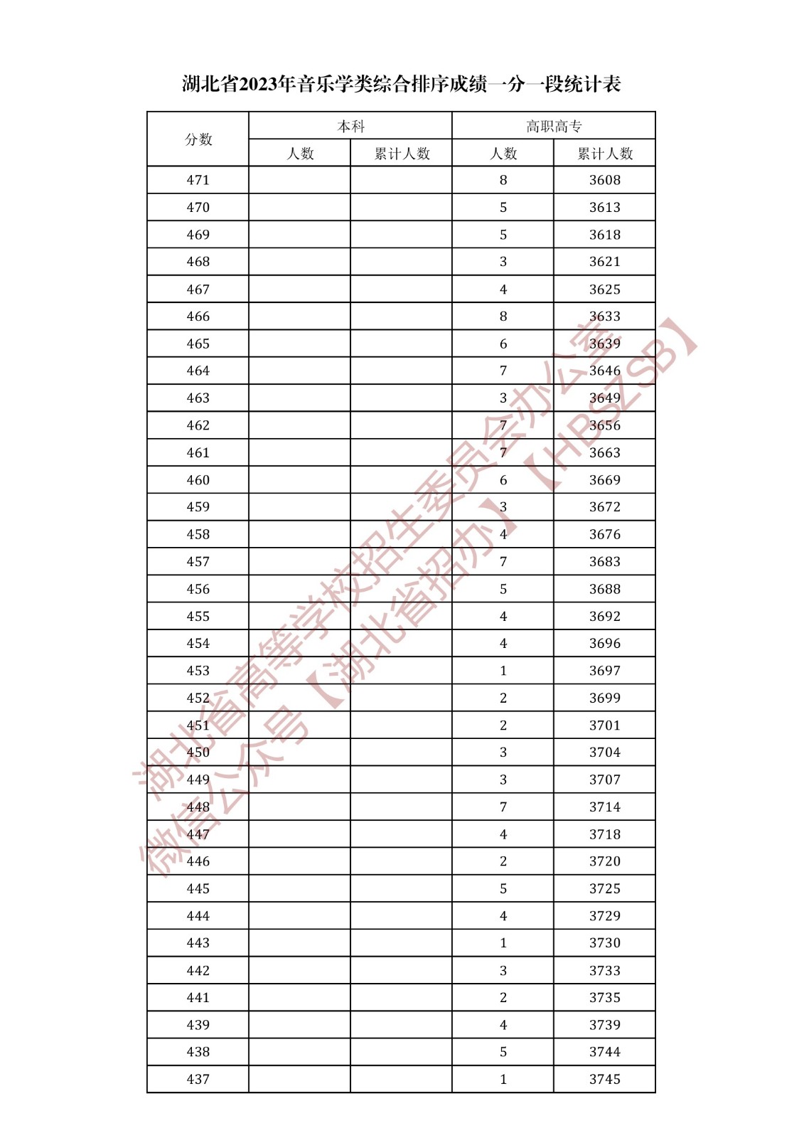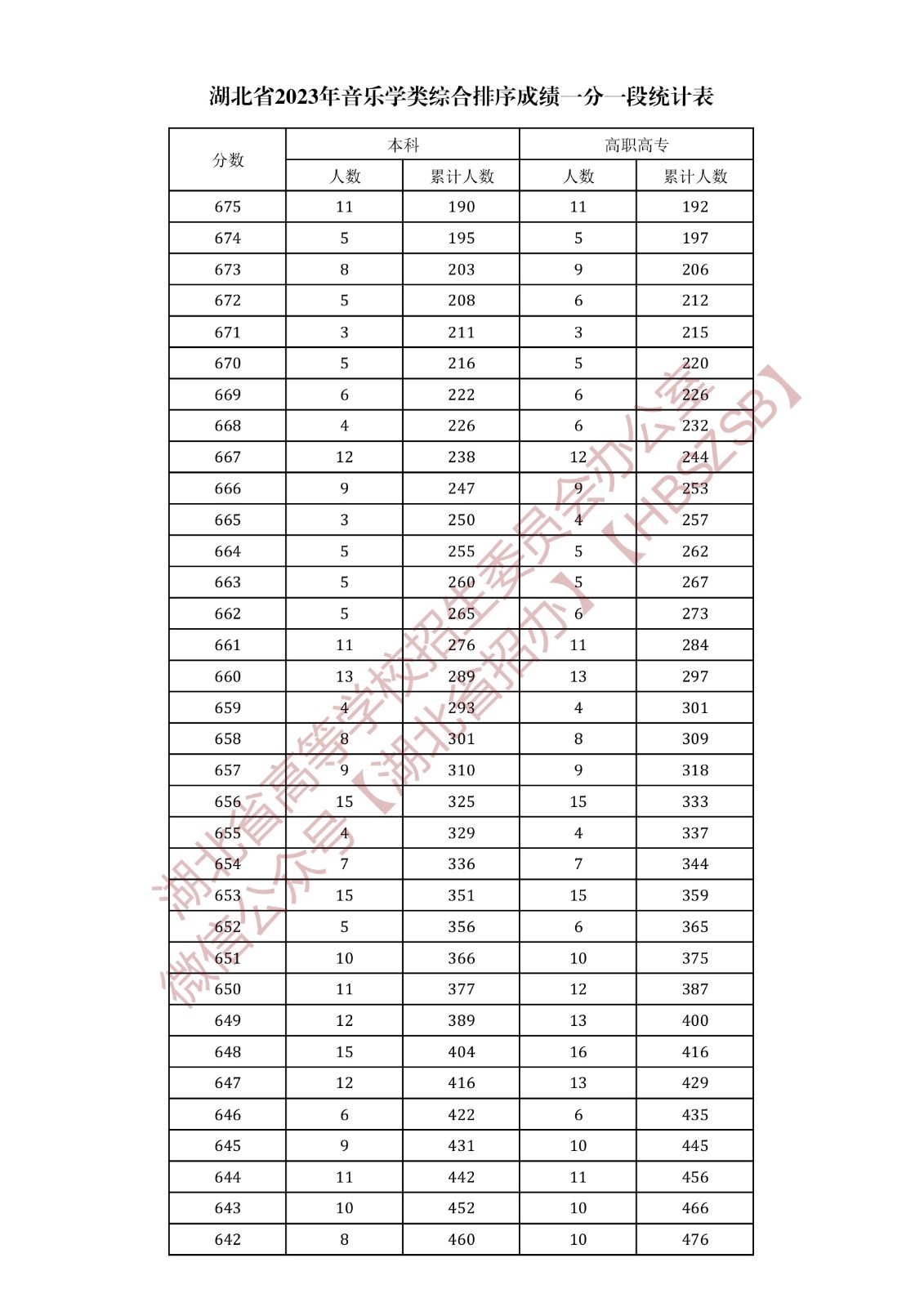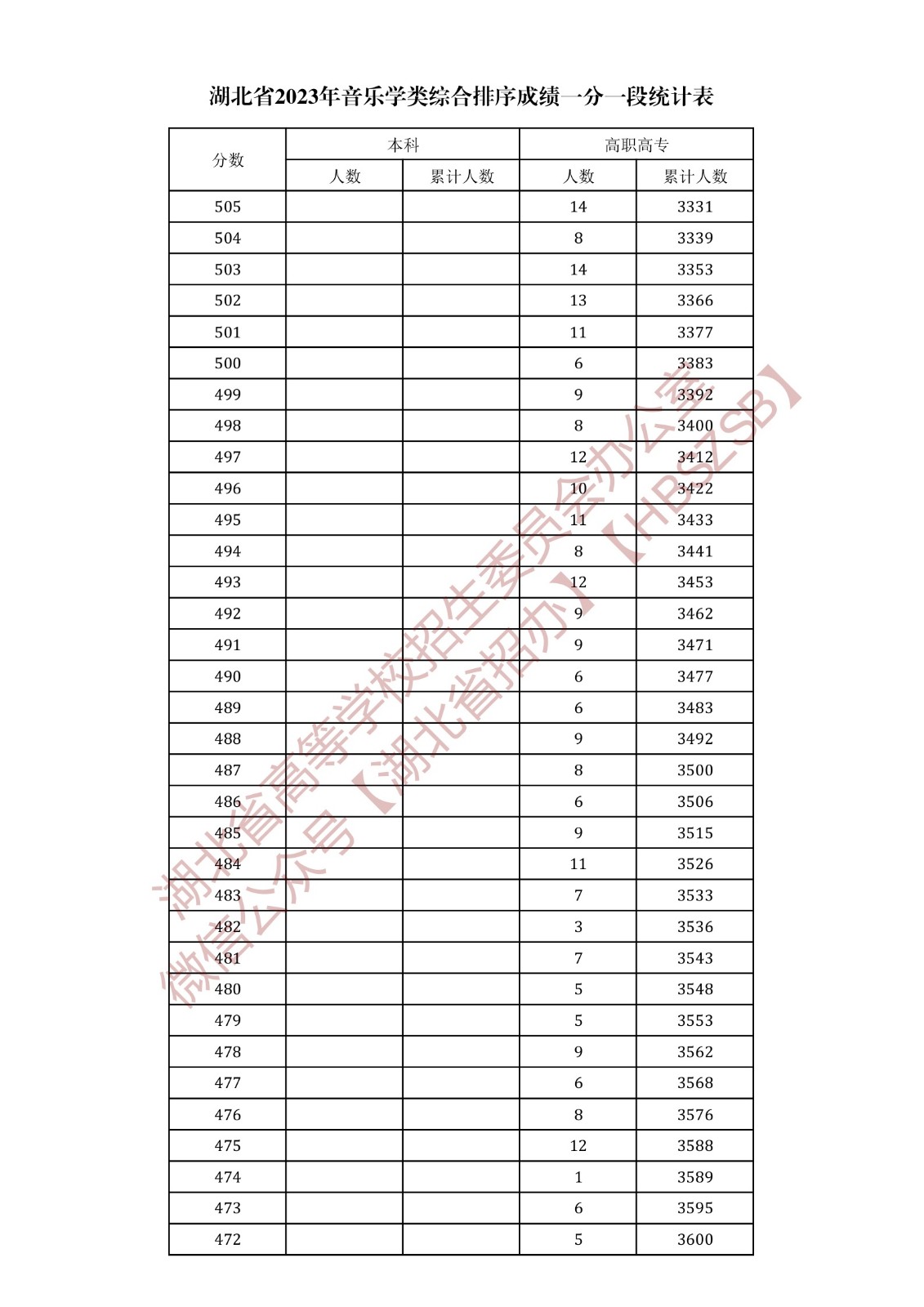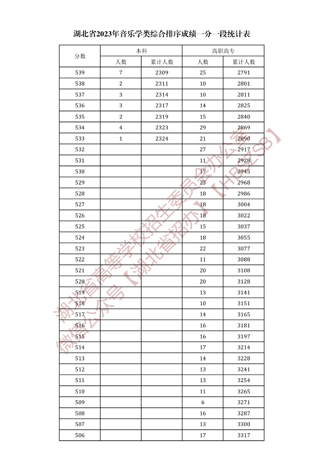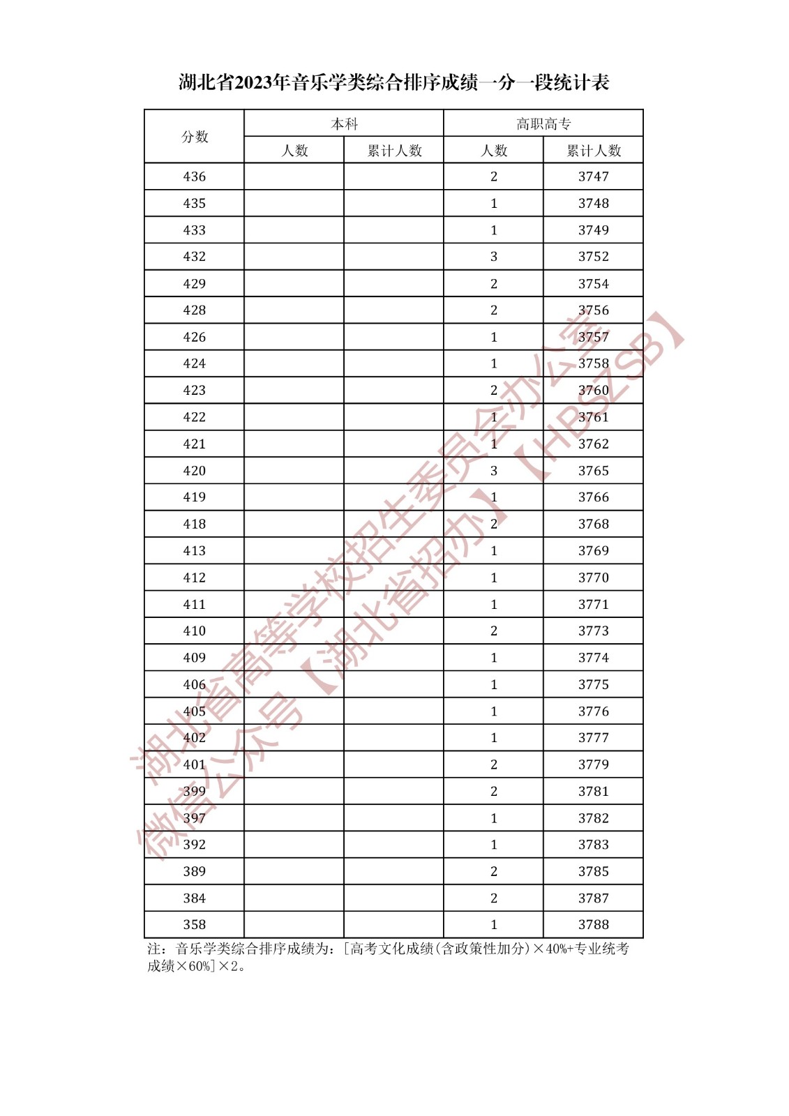 湖北省2023年音樂學類綜合排序成績一分一段統計表