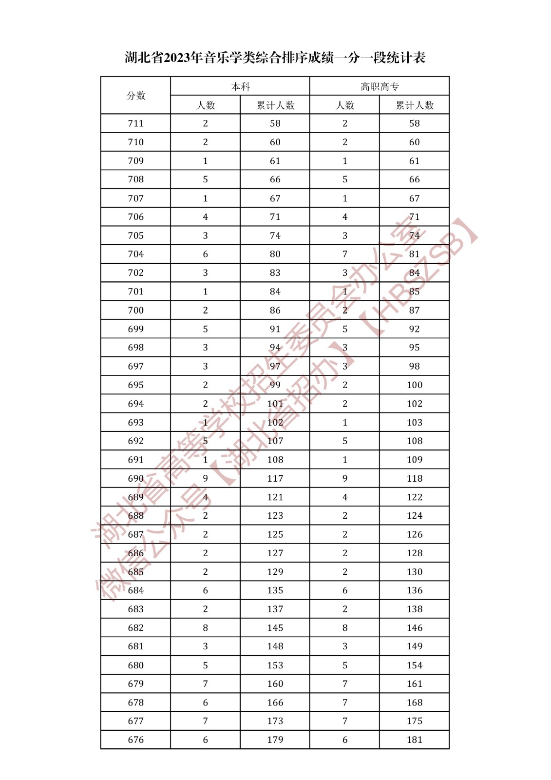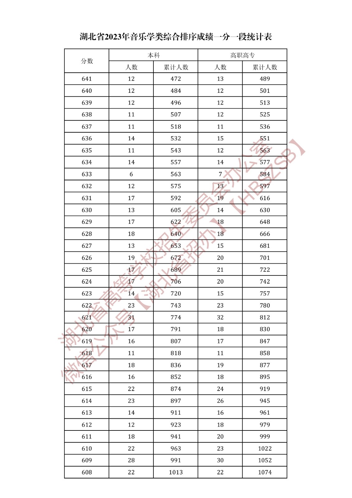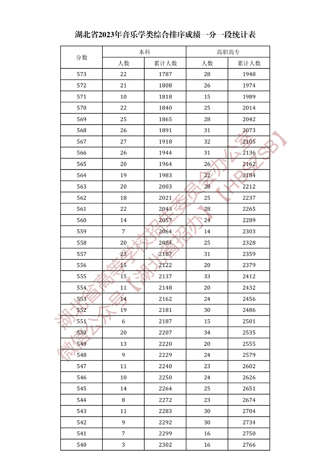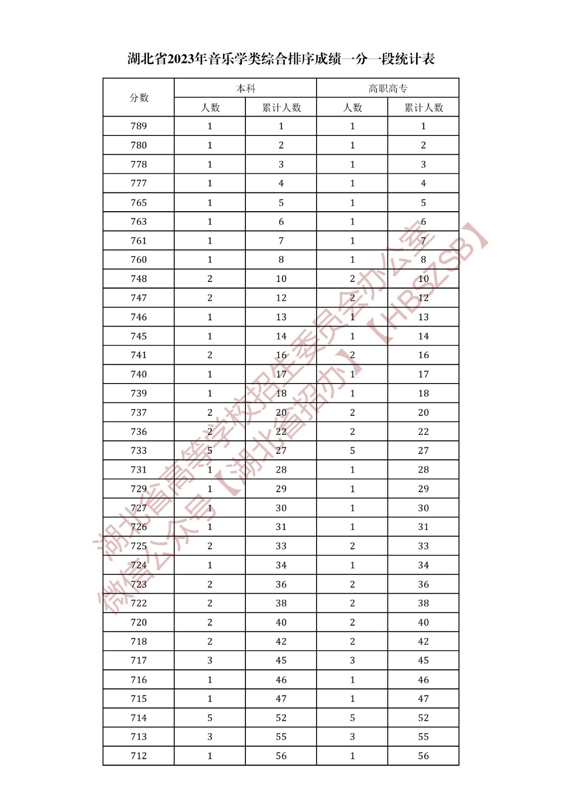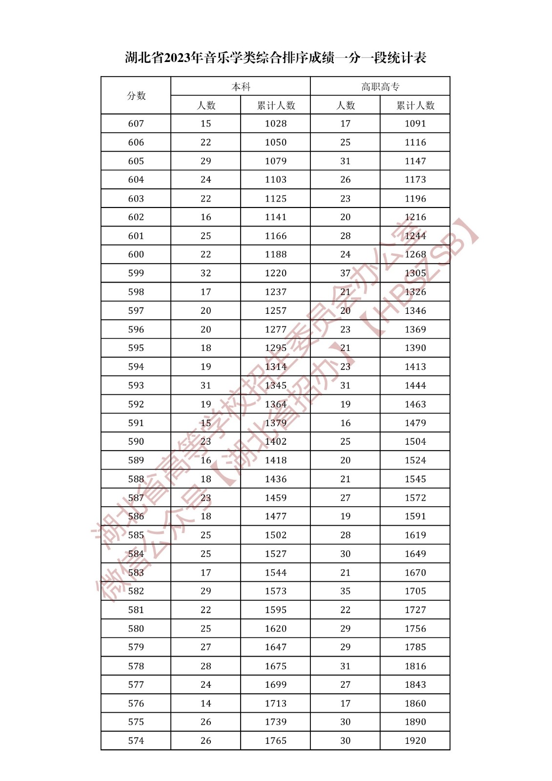 湖北省2023年音樂學類綜合排序成績一分一段統計表