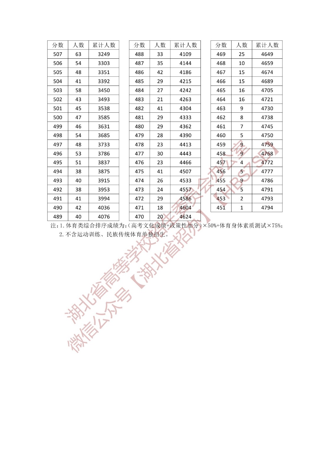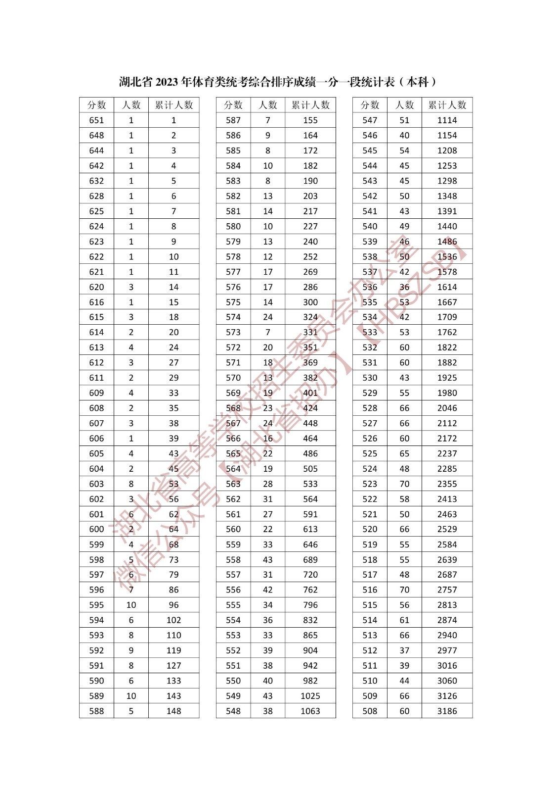 湖北省2023年體育類統考綜合排序成績一分一段統計表(本科)