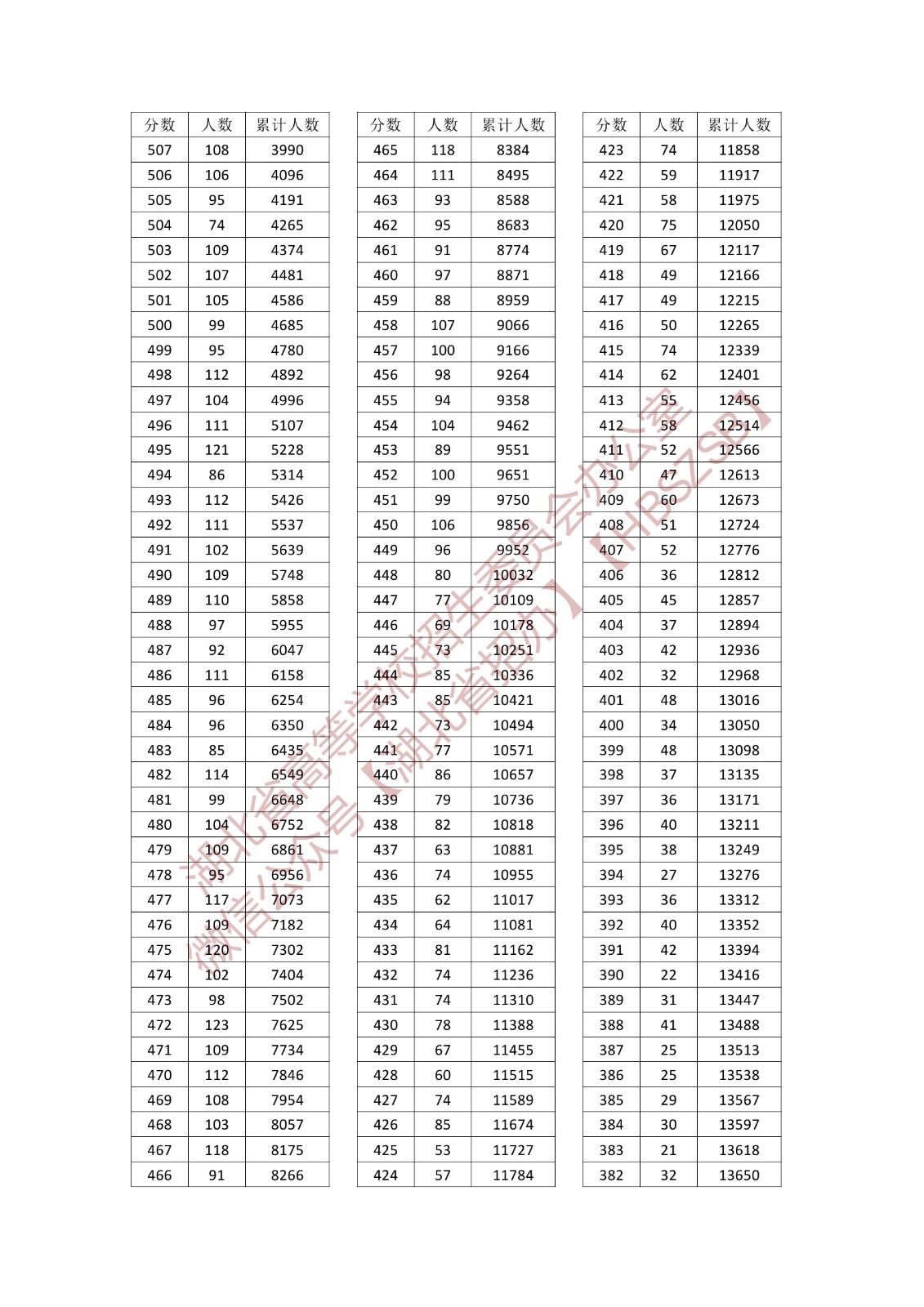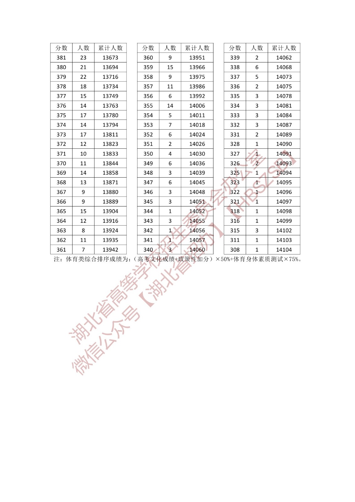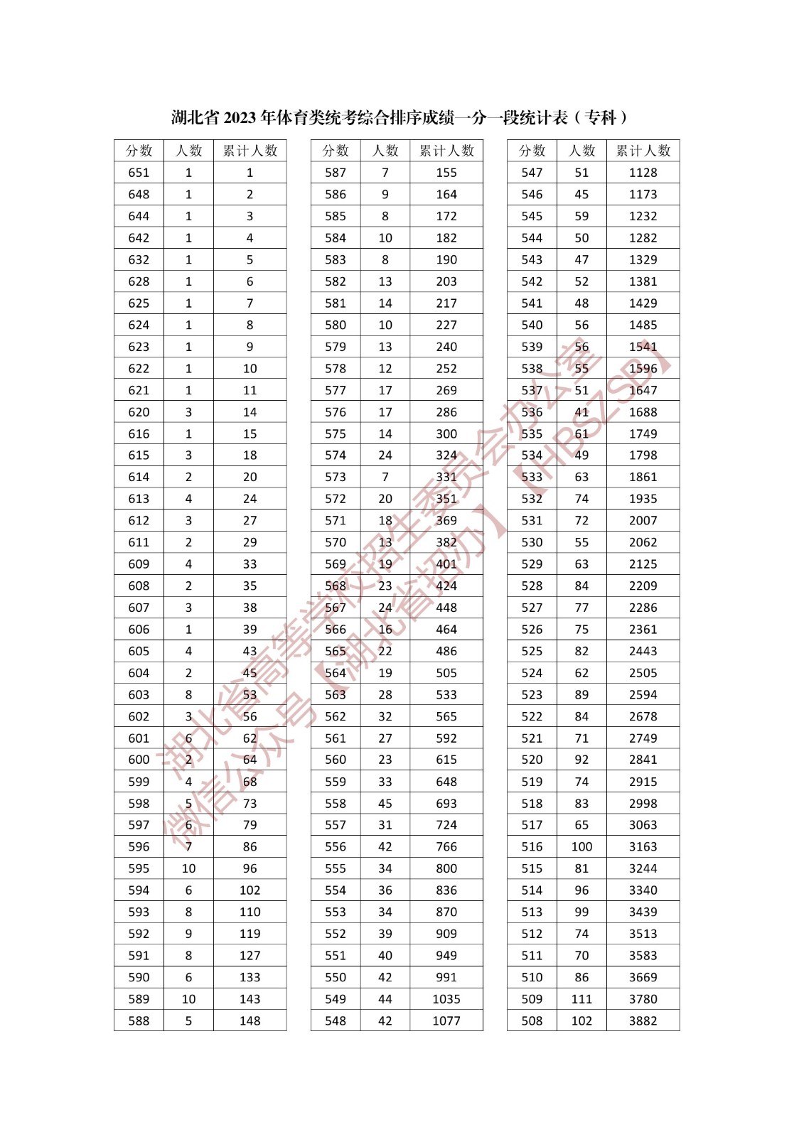 湖北省2023年體育類統考綜合排序成績一分一段統計表(專科)