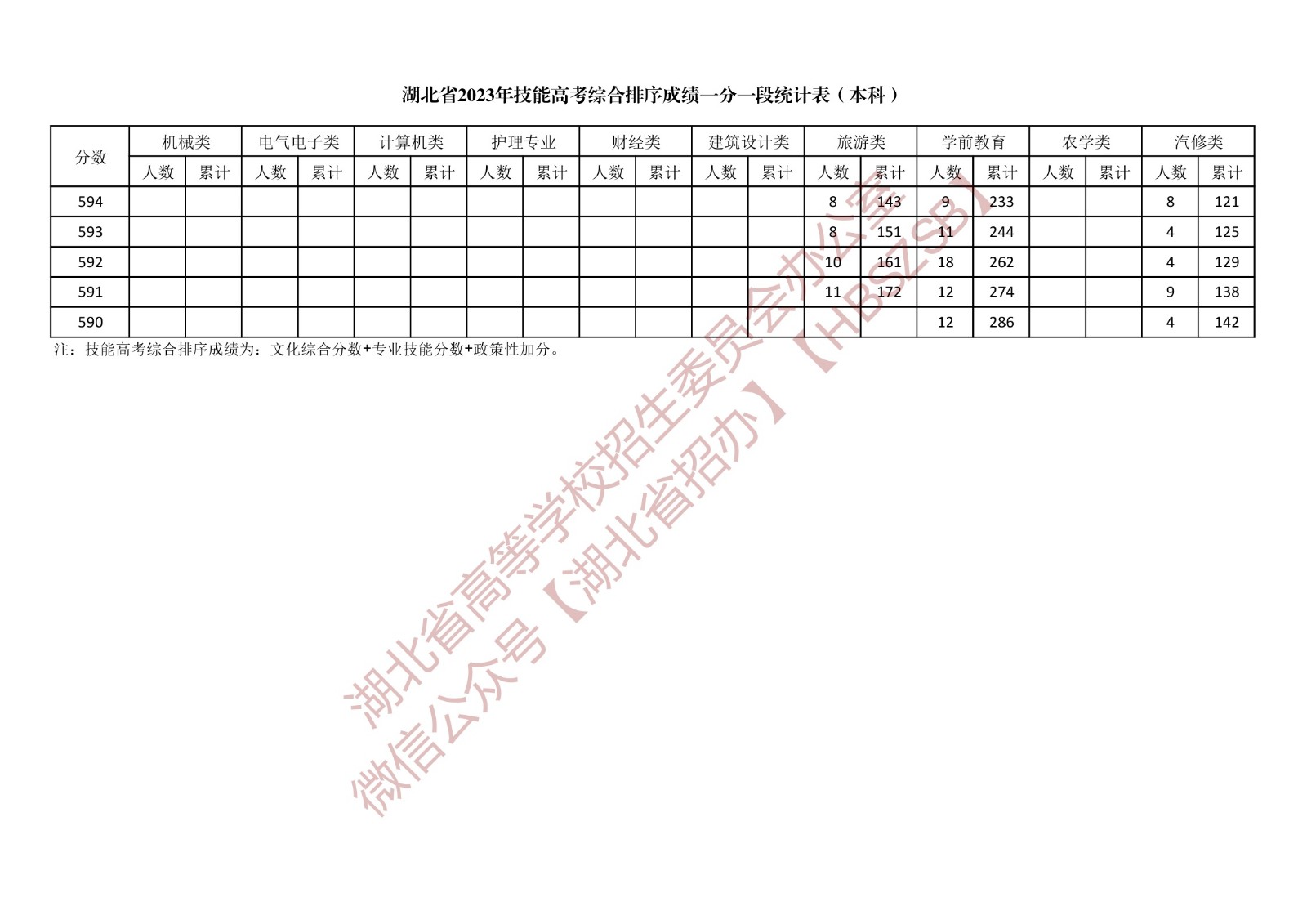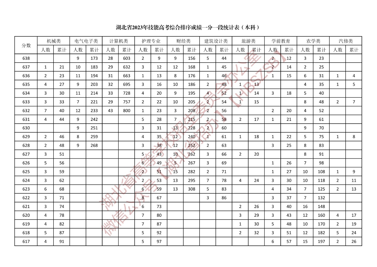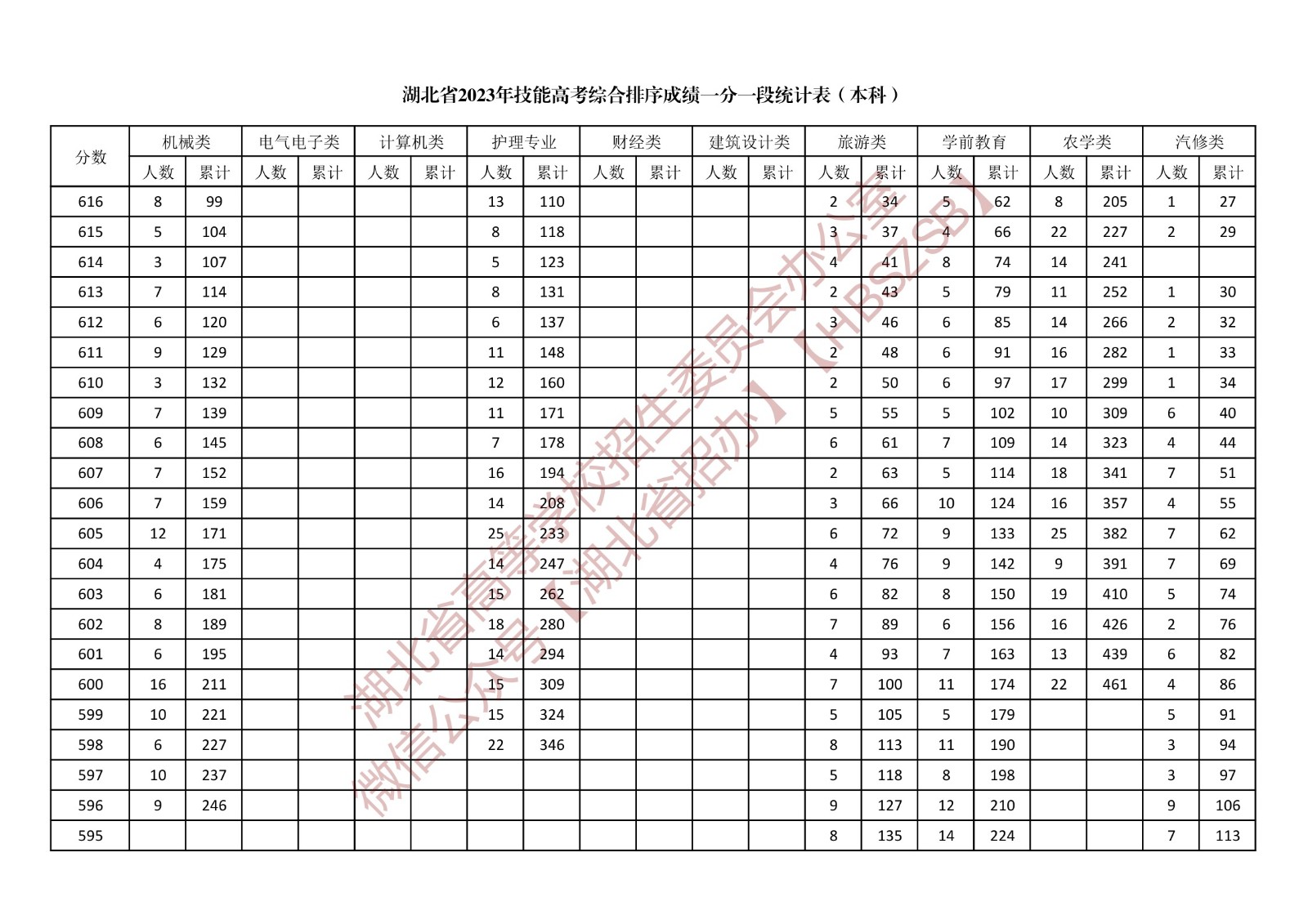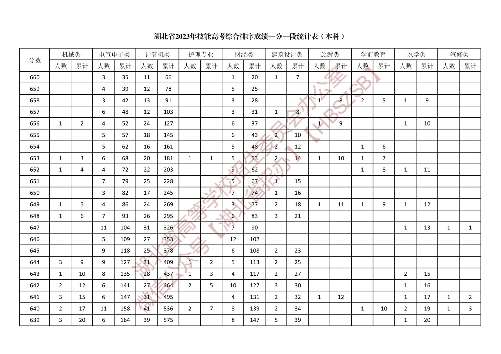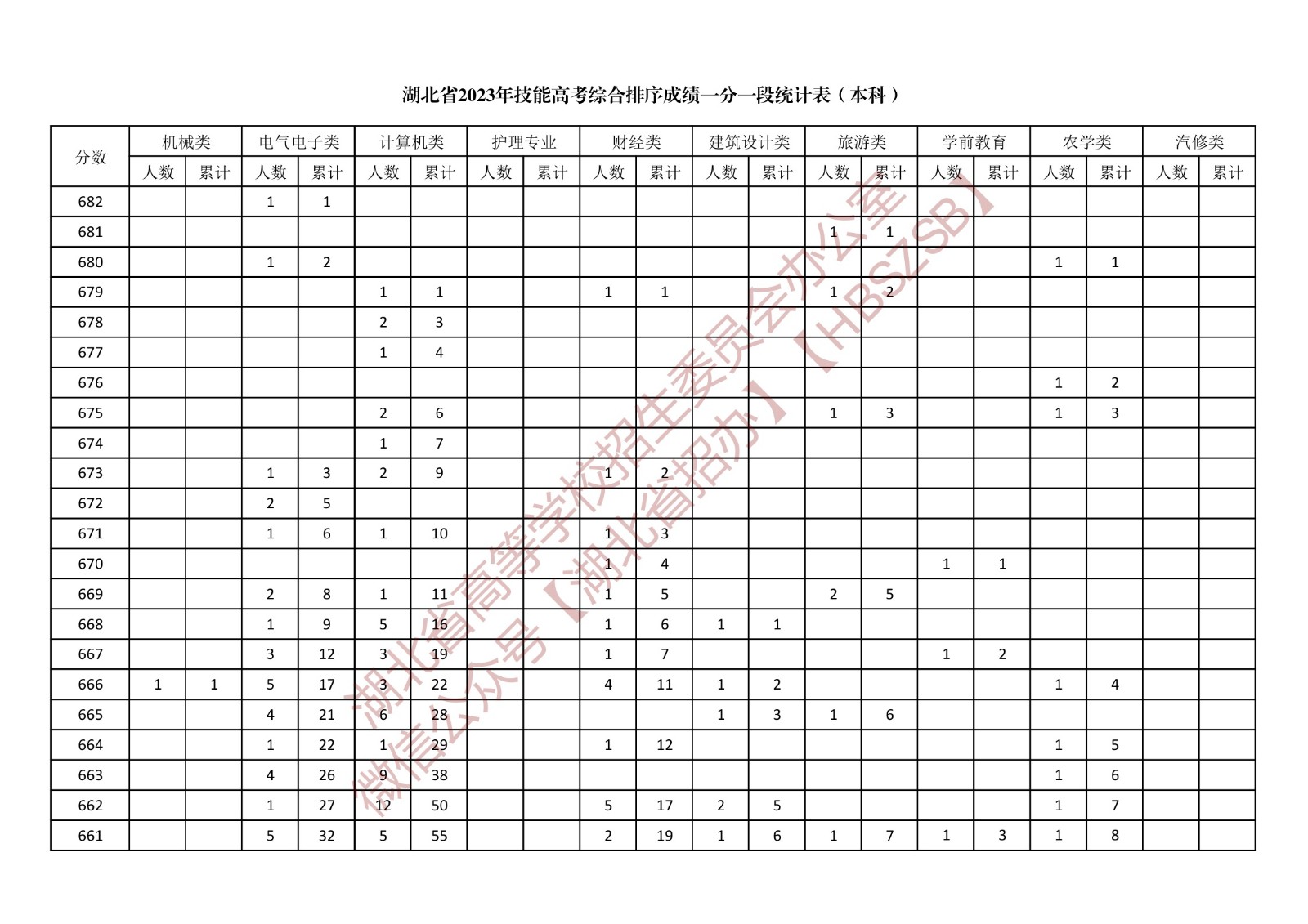湖北省2023年技能高考綜合排序成績一分一段統計表(本科)