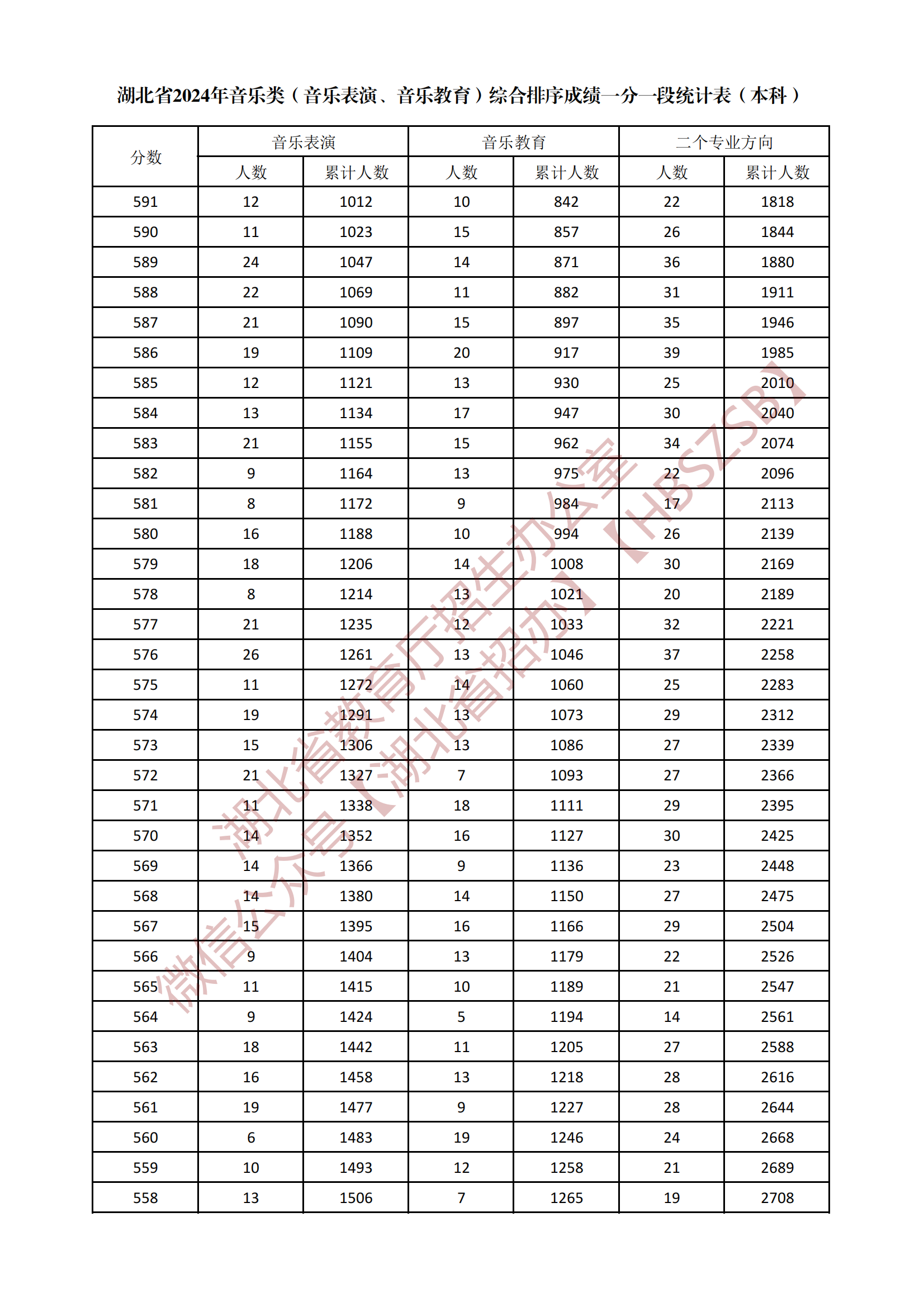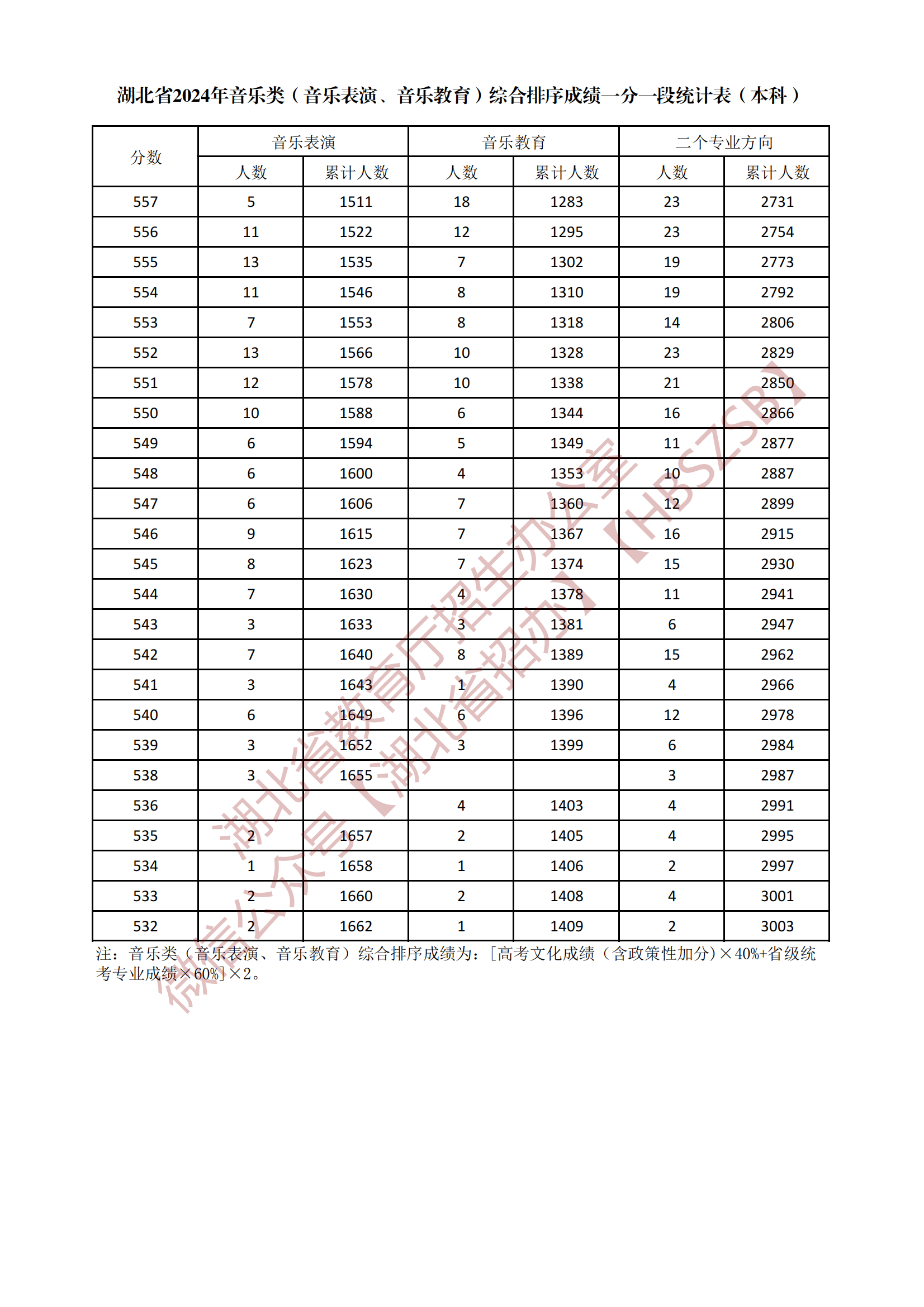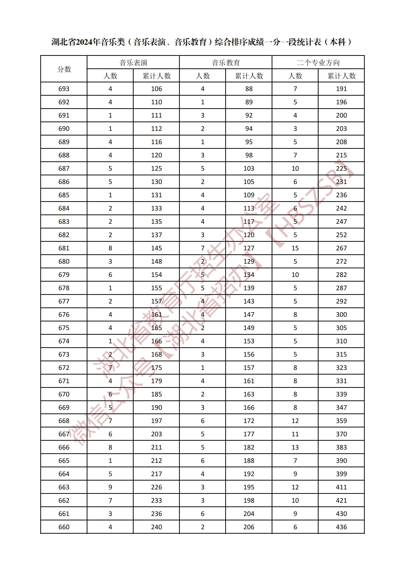 湖北省2024年音樂類(音樂表演、音樂教育)綜合排序成績一分一段統計表(本科)