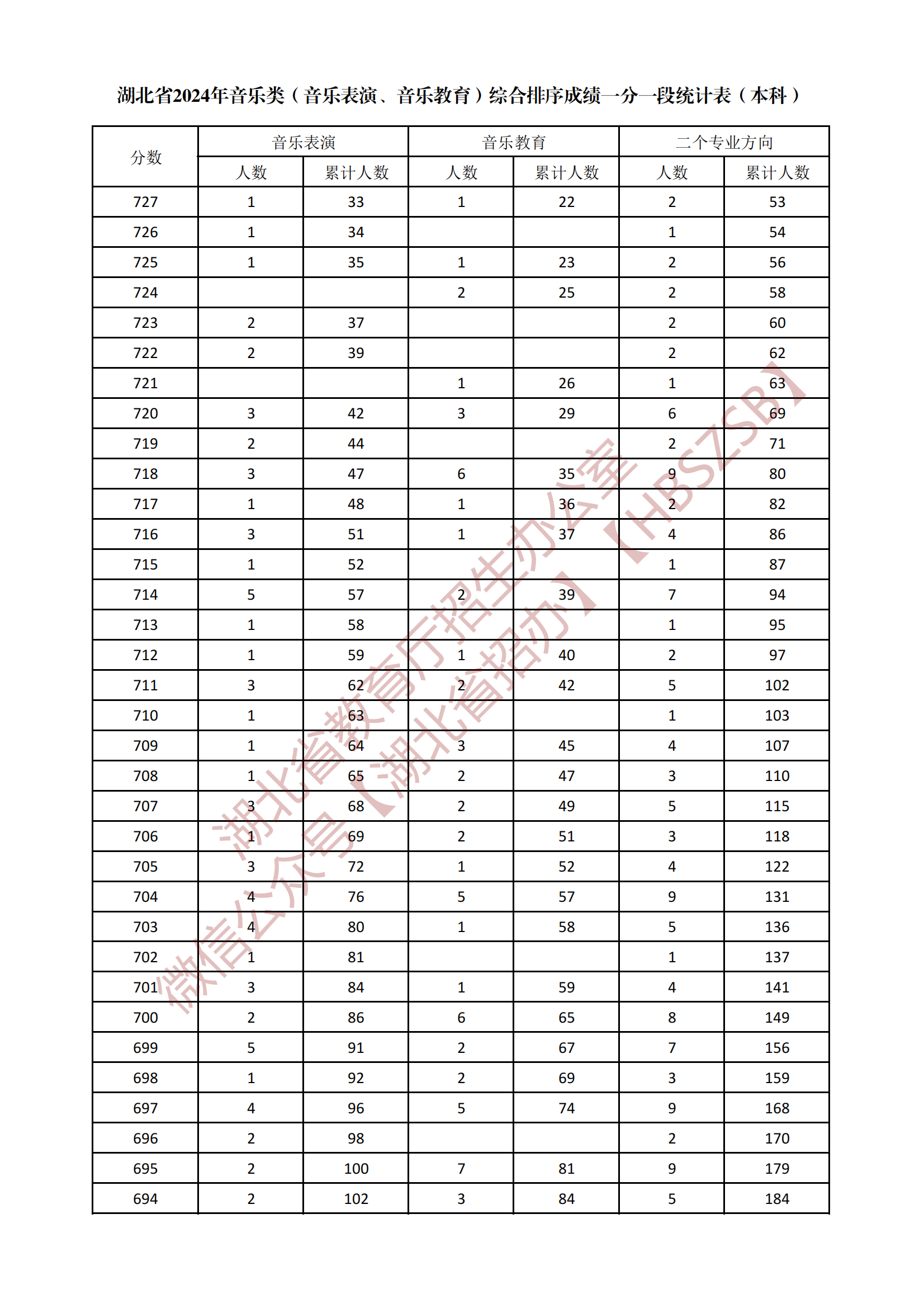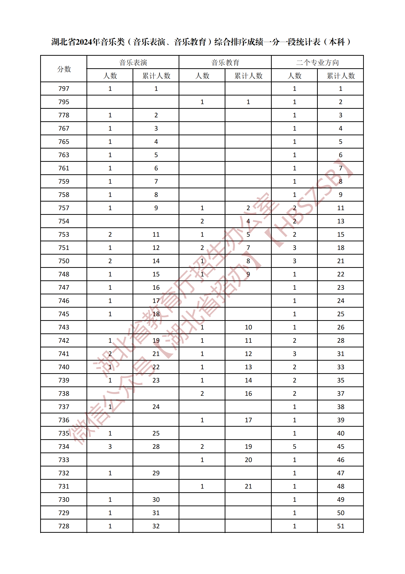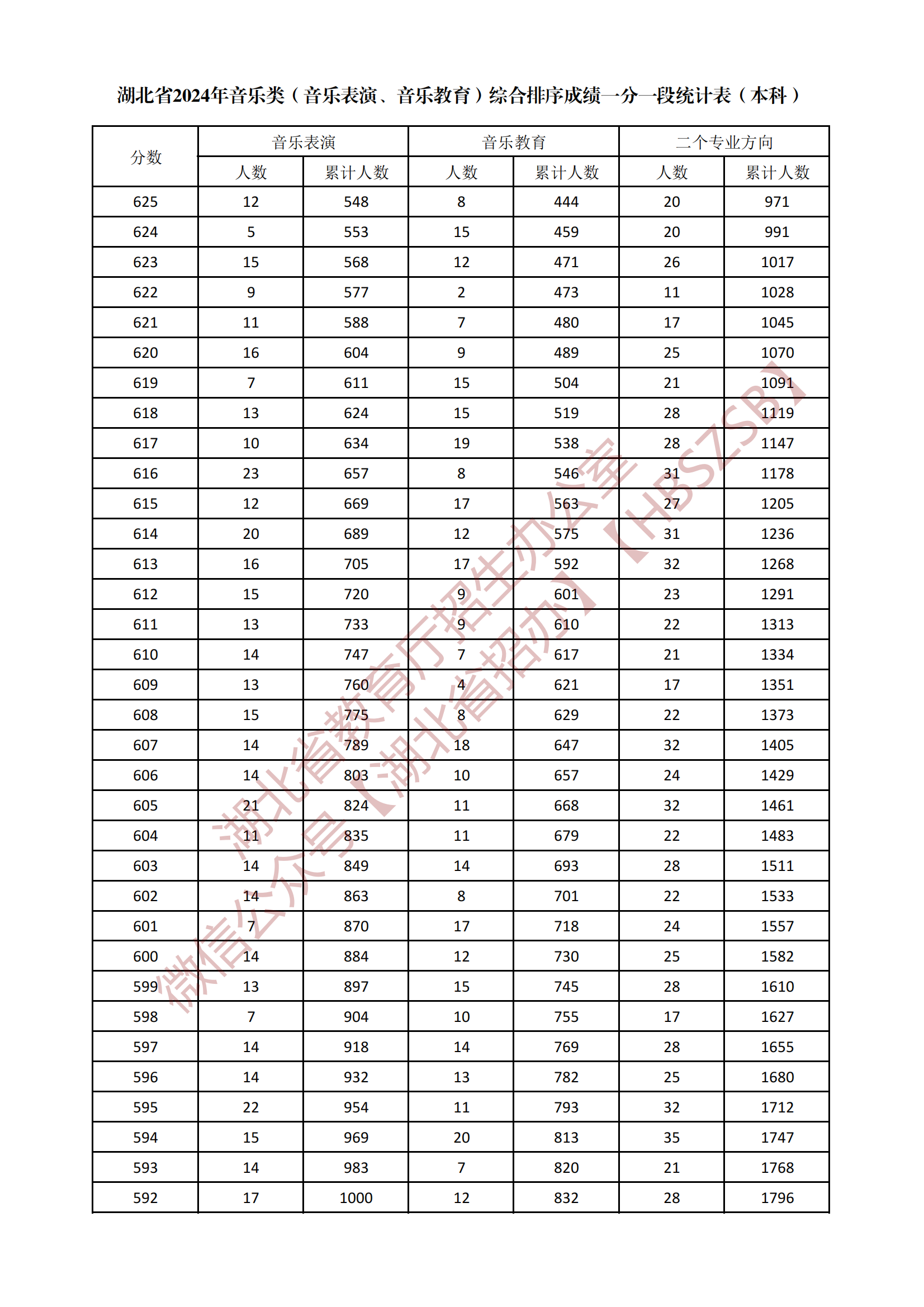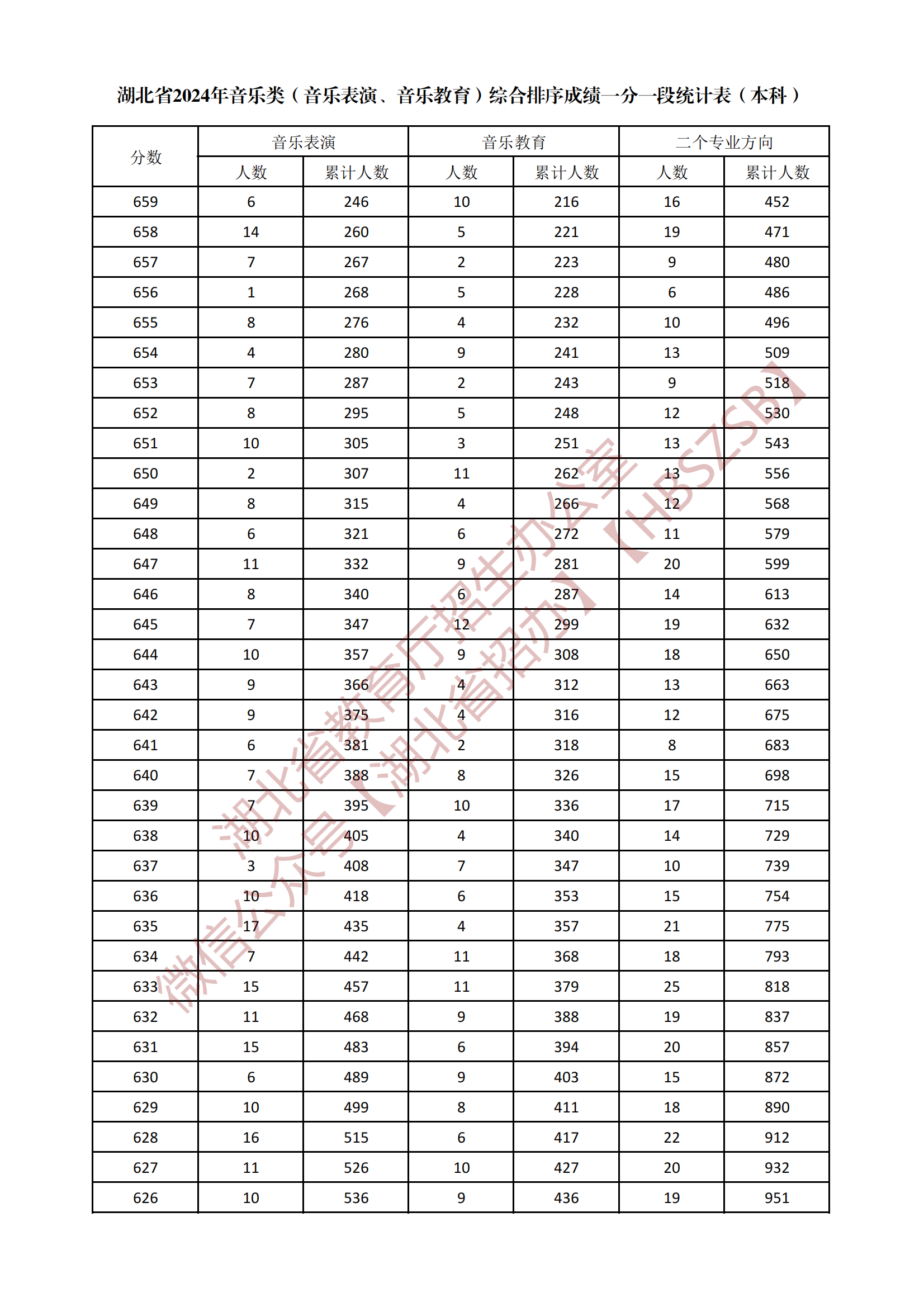 湖北省2024年音樂類(音樂表演、音樂教育)綜合排序成績一分一段統計表(本科)