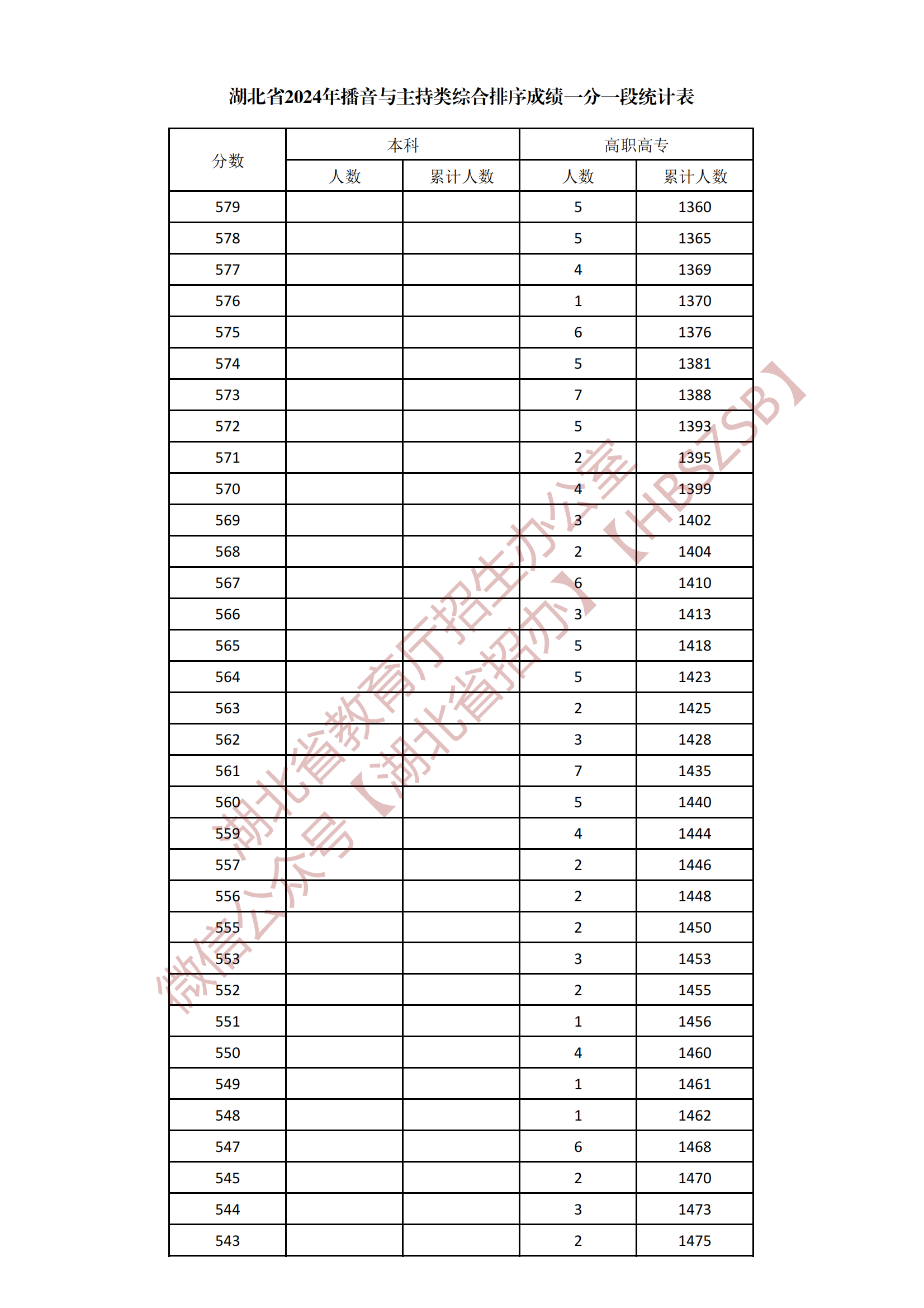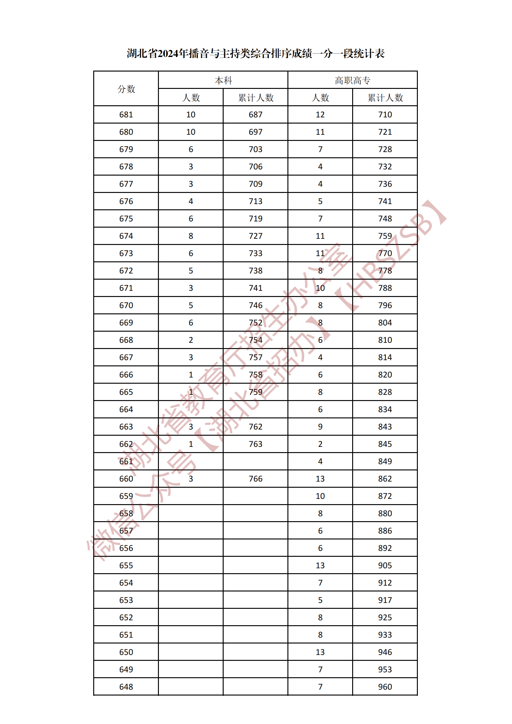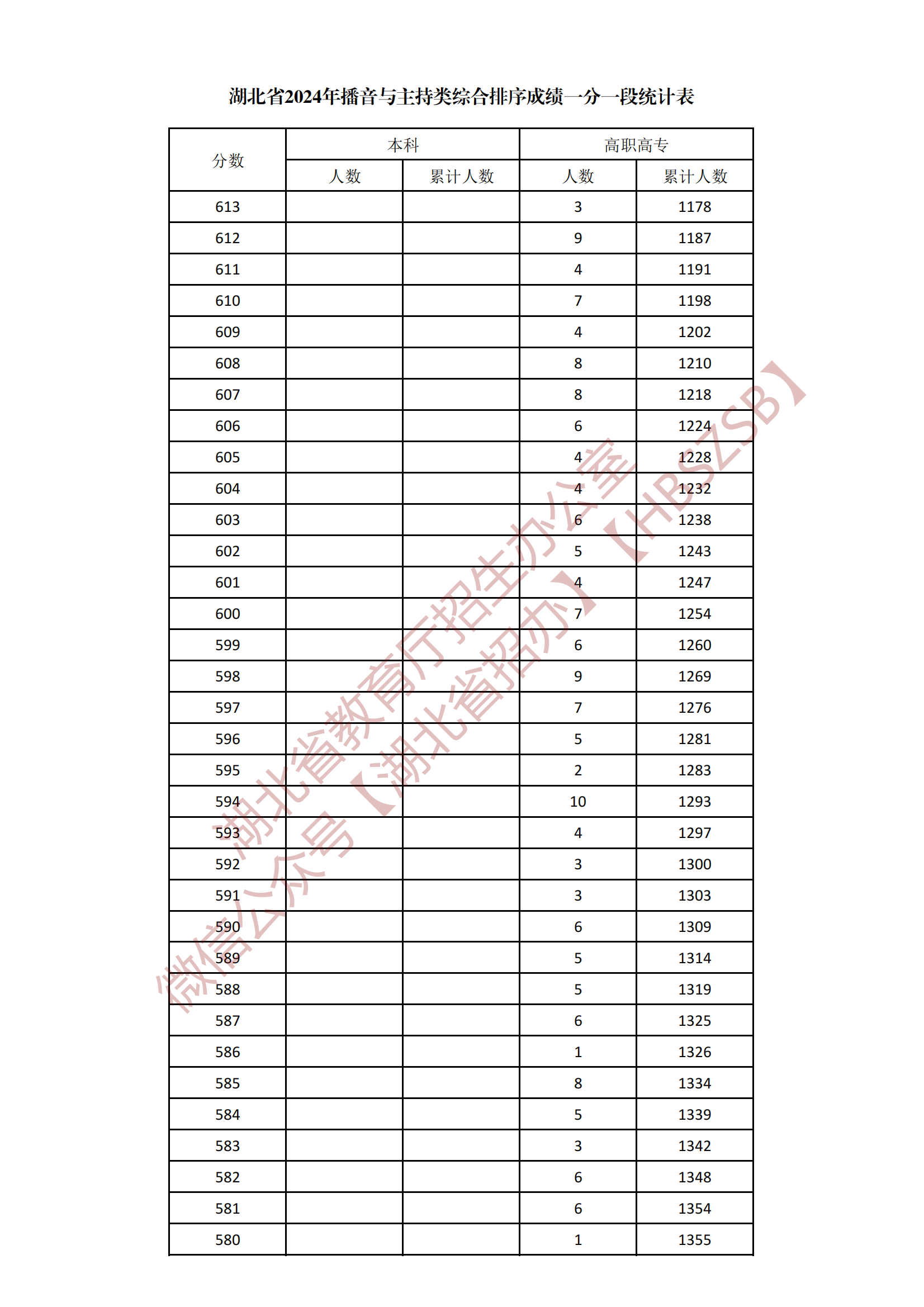 湖北省2024年播音與主持類綜合排序成績一分一段統計表