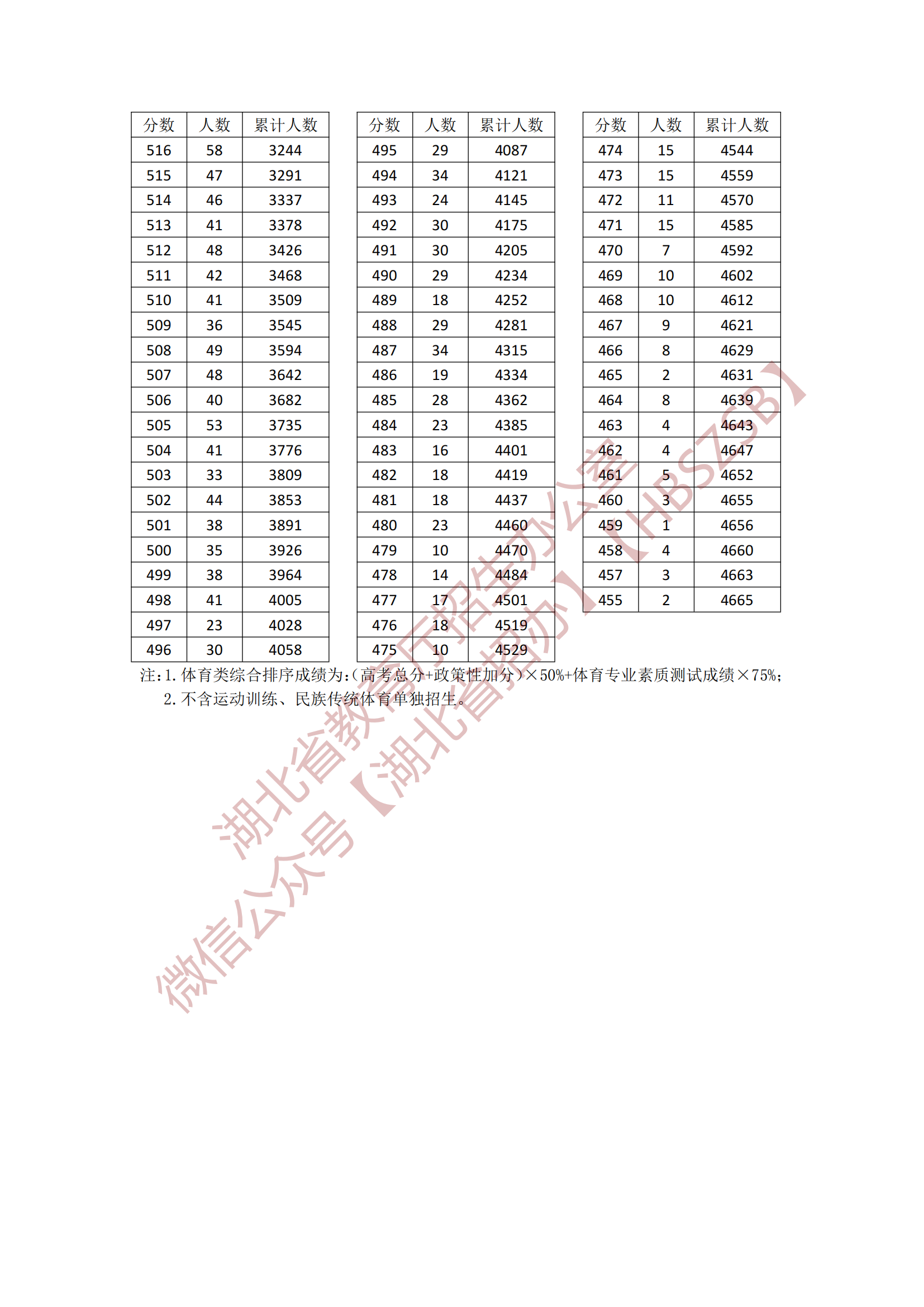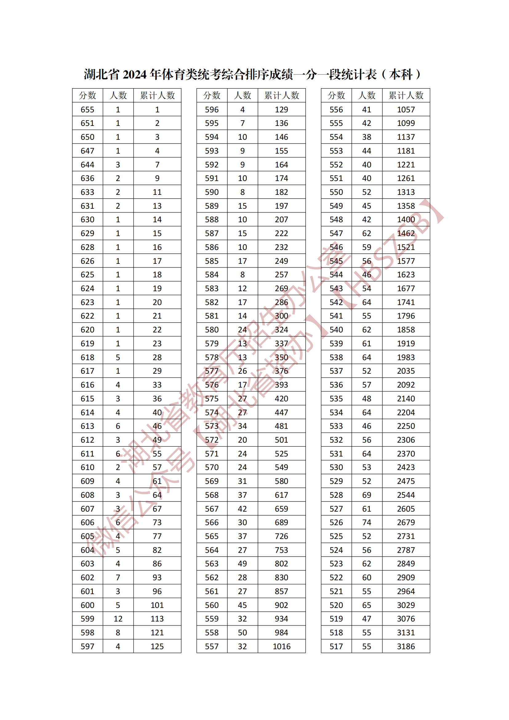 湖北省2024年體育類統(tǒng)考綜合排序成績一分一段統(tǒng)計表(本科)
